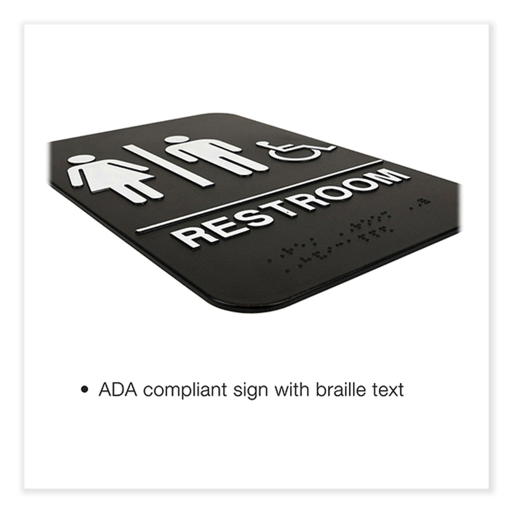 This label clearly indicates the restroom's location within the premises. Includes gender by symbol, writing, and braille text. This sign comes with adhesive strips for easy and secure mounting. With its simple-to-use application, this sign will help direct and keep everyone in the right place.