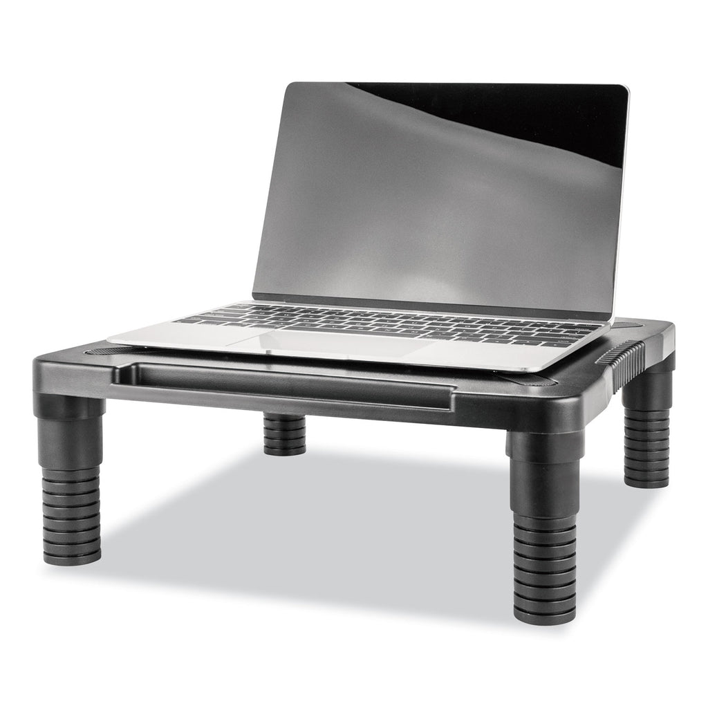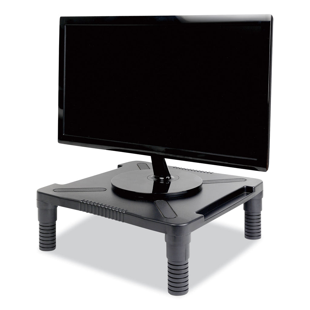 Elevates monitor to provide a more comfortable viewing level. Constructed from strong durable plastic. Non-skid rubber feet protect surface. Fits most flat panel monitors up to 24''.