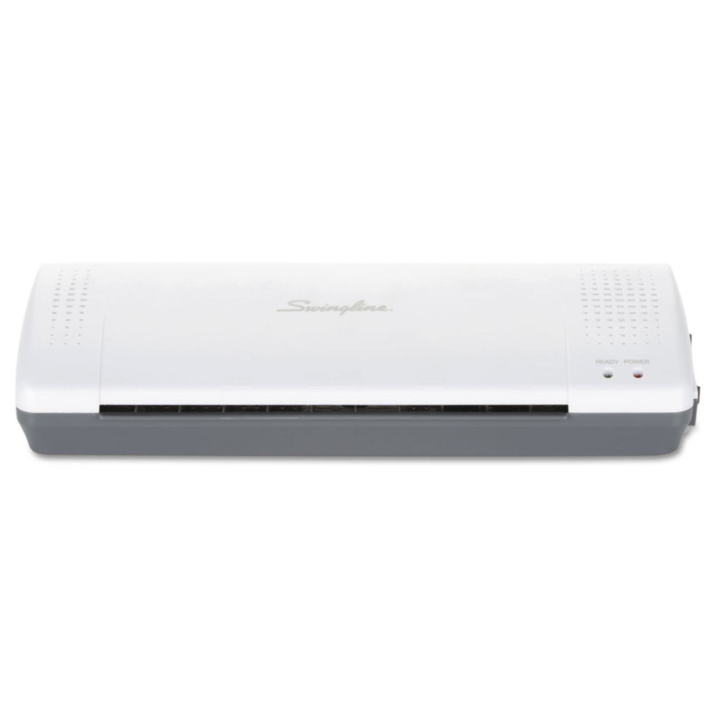 Provides high quality laminating and is incredibly easy-to-use. A single power setting laminates 3 or 5 mil pouches. A power indicator and a ready indicator light clearly let you know when you can begin laminating. Warms up in four minutes and laminates any item up to 9" wide. You can also select cold lamination for use with pressure-sensitive, self-adhesive pouches. With a laminating speed of 9" per minute you can remain productive and still protect all your important documents and favorite photos. A jam release lever is included to easily correct alignment of misfed pouches. A starter pack of 5 letter-size, standard thickness pouches is included.