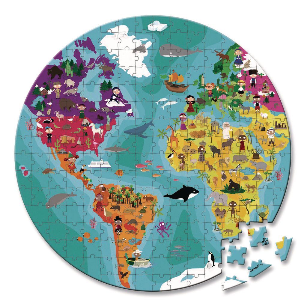Geographic map puzzle to stimulate the mind and increase awareness of the world around us. Shows vibrant images of regional wildlife and famous sites. A great way to learn about the world. Suitable for kids who love puzzles and nature.