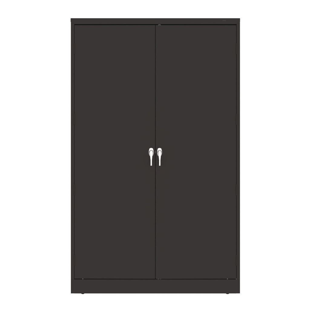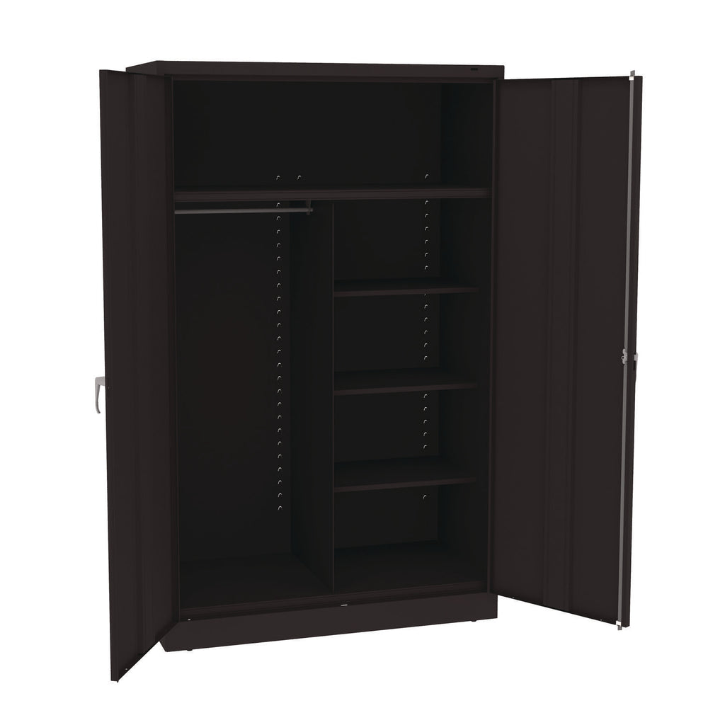 Fully welded steel construction with sturdy box-formed shelves. Full-width top shelf, four adjustable side shelves and 2.75" wide wardrobe rod. Heavy-duty leaf hinges and secure three-point locking system.