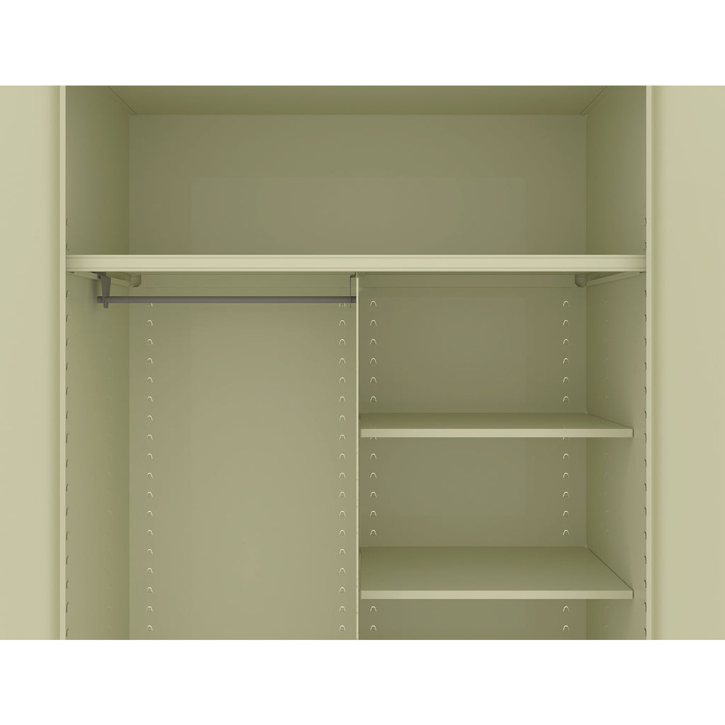 Fully welded steel construction with sturdy box-formed shelves. Full-width top shelf, four adjustable side shelves and 2.75" wide wardrobe rod. Heavy-duty leaf hinges and secure three-point locking system.