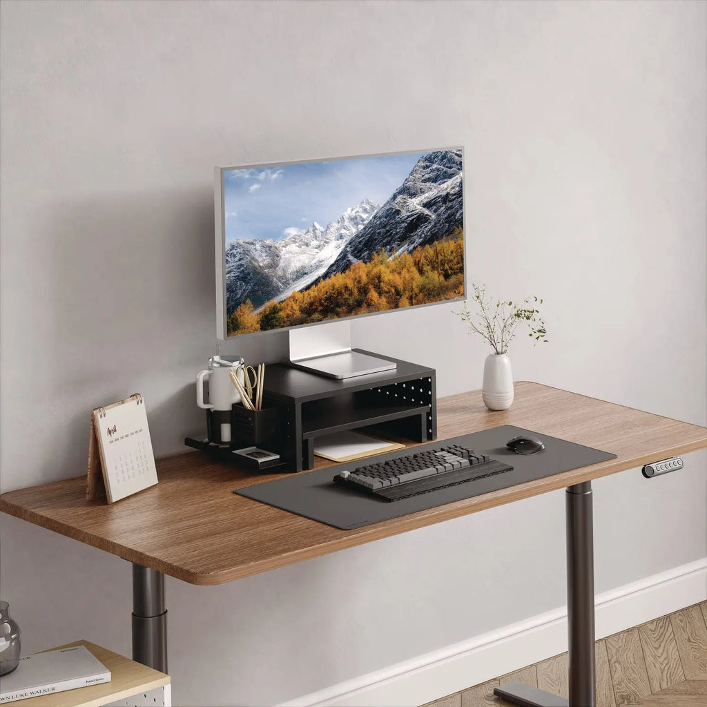 Two versatile risers with pegboards. Ergonomic design elevates the screen to eye level for better viewing. Desk organizer adds more space for additional desk storage. Two large MDF platforms 16.7" x 12" each hold your computer or laptop. Handy accessories include tray pen cup beverage holder and headphone holders. Weight capacity of 44 lbs for each riser.