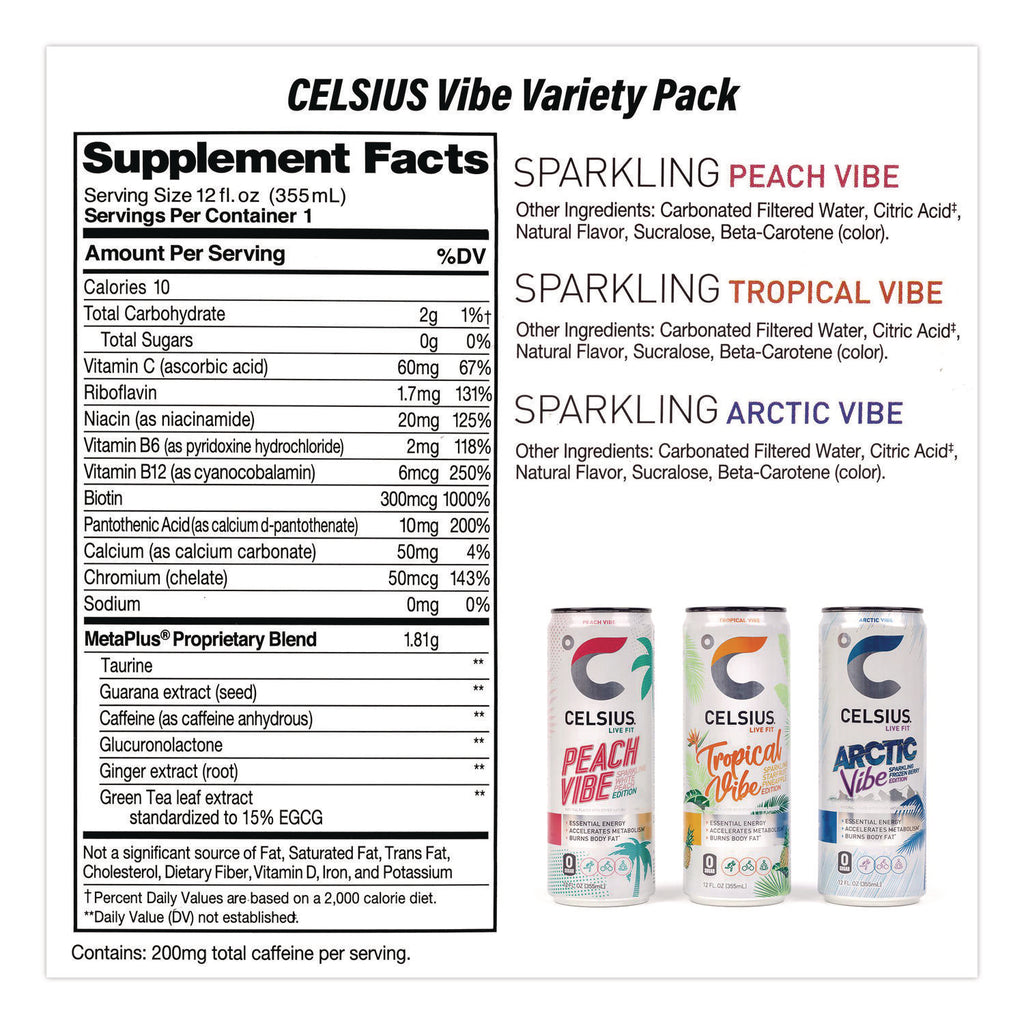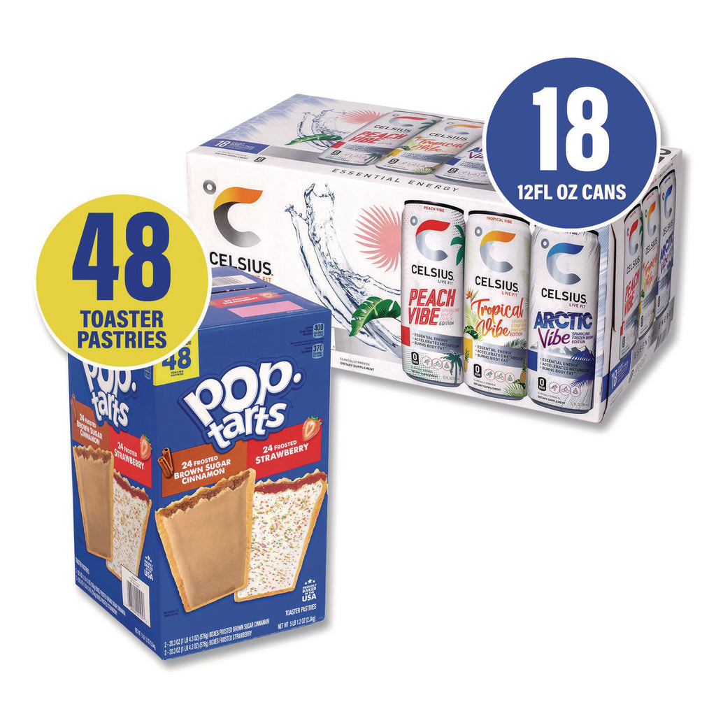 - Includes Celsius Vibe Variety Pack (Peach Vibe, Tropical Vibe, and Arctic Vibe) and Kellogg's Pop Tarts Variety Pack (Frosted Strawberry and Frosted Brown Sugar Cinnamon).