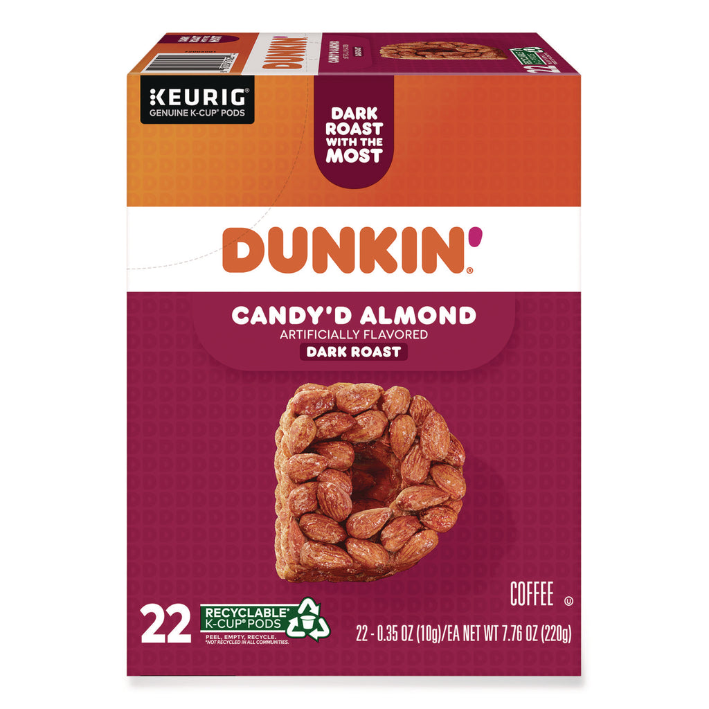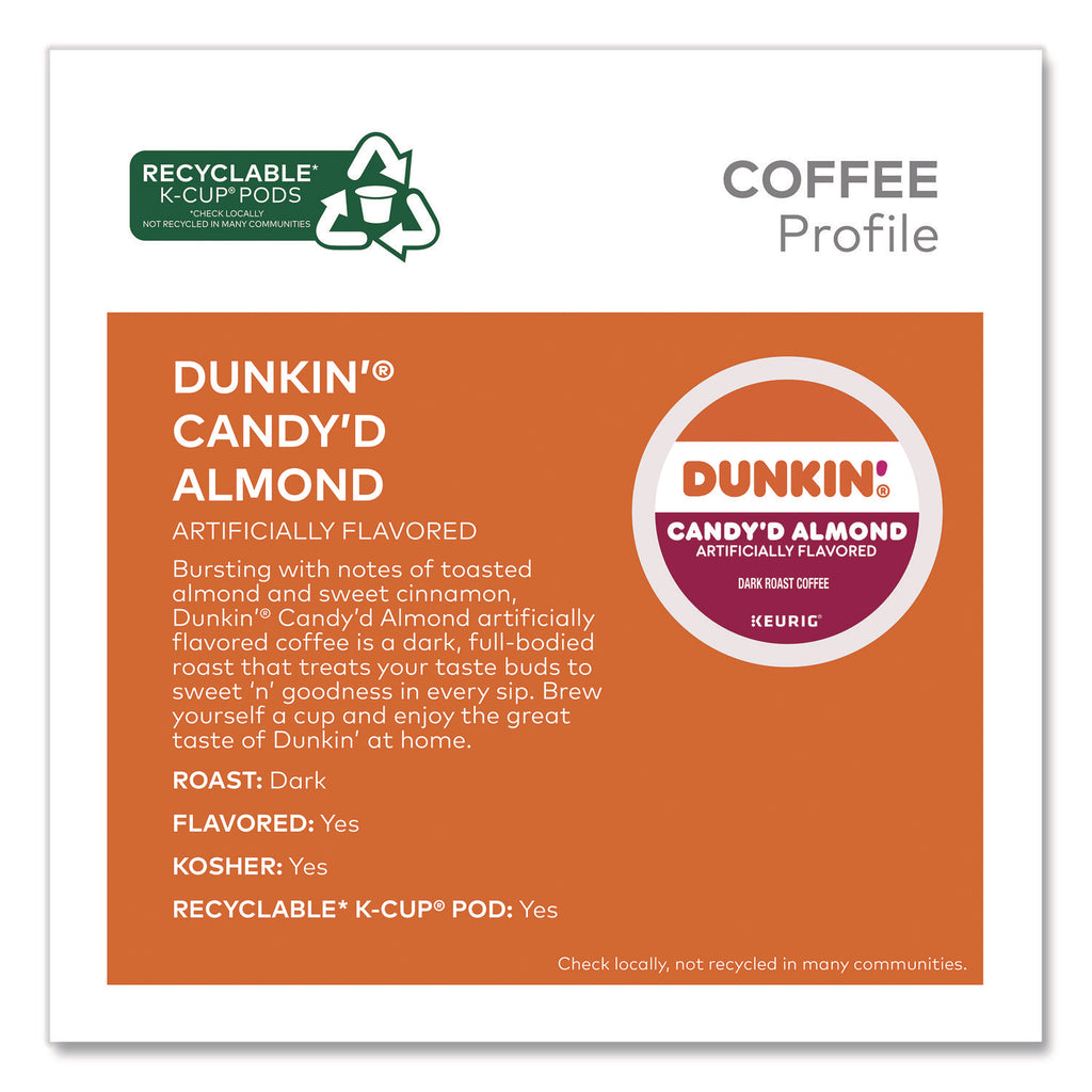 Bursting with notes of toasted almond and sweet cinnamon, the Dunkin' Candy'd Almond artificially flavored coffee is a dark full-bodied roast that treats your taste buds to sweet and goodness in every sip. Brew yourself a cup and enjoy the great taste of Dunkin' at home. Made with 100% arabica coffee, Orthodox Union Kosher certified, and compatible with all Keurig single-serve coffee makers. Comes in the Keurig recyclable K-Cup pod: simple, delicious, and recyclable. Enjoy the same great-tasting coffee you know and love, and when you're done peel, empty, and recycle (check locally, not recycled in all communities).