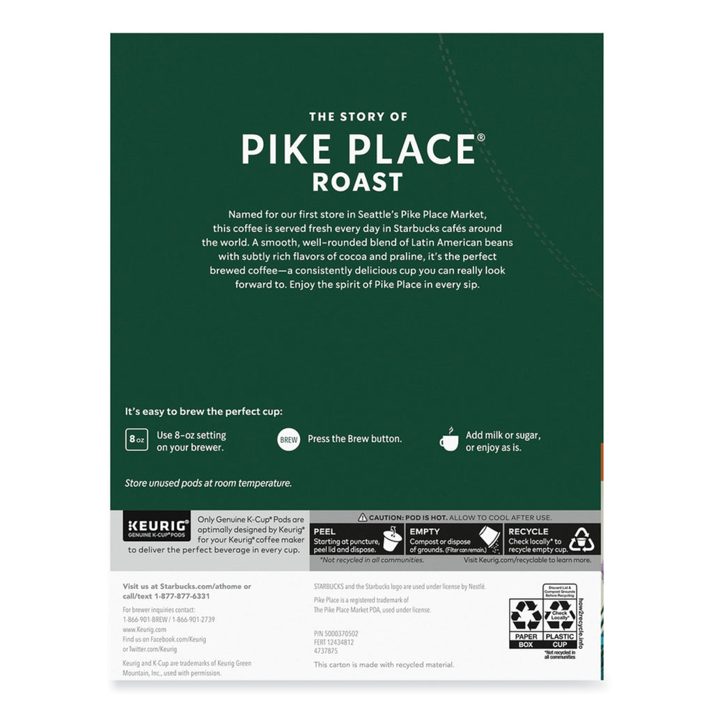 Enjoy the classic taste of Starbucks® Pike Place Coffee, now in the convenience of K-Cups. This smooth, balanced medium roast has hints of cocoa and rich praline, making it a perfect choice for your everyday coffee.