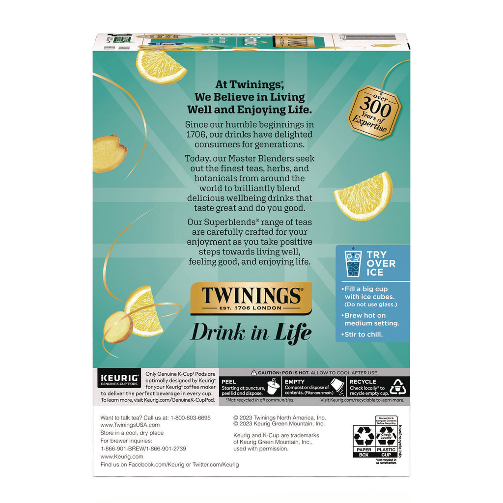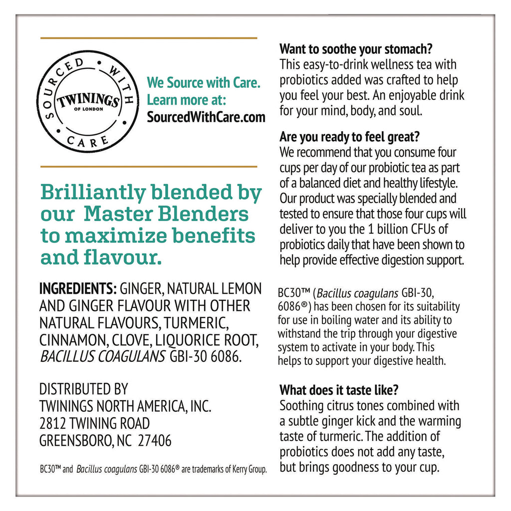 Soothe your stomach as you sip this Twinings Probiotics+ herbal tea which combines a zesty lemon flavor and warming ginger and includes a probiotic for extra digestive support. The soothing citrus tones in this herbal tea are combined with a subtle ginger kick and the warming taste of turmeric. This blend supports your digestive health with the addition of probiotics, which do not add any taste, but bring goodness to your cup.