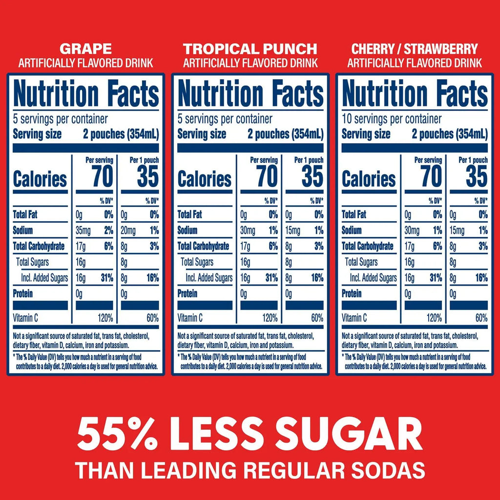 Real fruit juice and 100% daily value of Vitamin C make this juice pouch variety pack a much better option than sugary sodas. Grab a pouch in one of four flavors, like Cherry, Grape, Strawberry Kiwi, or Tropical Punch and enjoy the classic deliciously fruity flavor of Kool Aid. This pack is perfect for packed lunches, or as an on-the-go drink.
