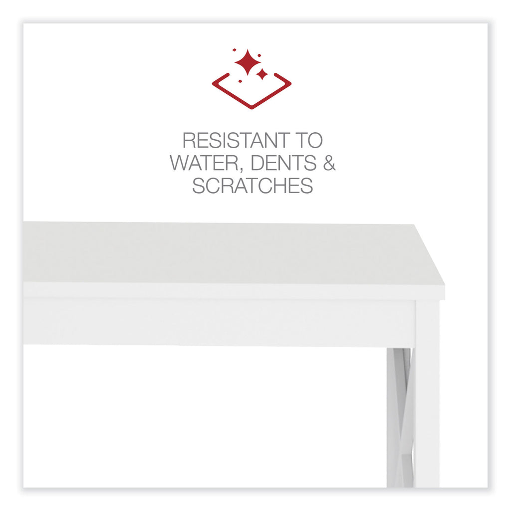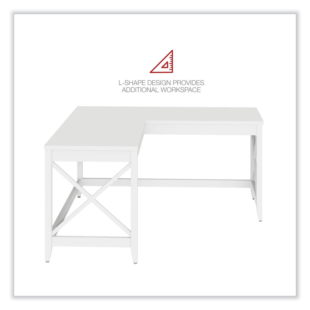 Stylish, L-shaped, farmhouse desk with X accents on side panels. The multi-function desk is constructed with a smooth, laminate wood top and white wood legs. The simple design without drawers fits conveniently into a corner to maximize space. Wide tabletop surfaces provide ample space to work and display organizational or decorative items. The open design has a light, airy feel, and coordinates with most décor. Some assembly is required.