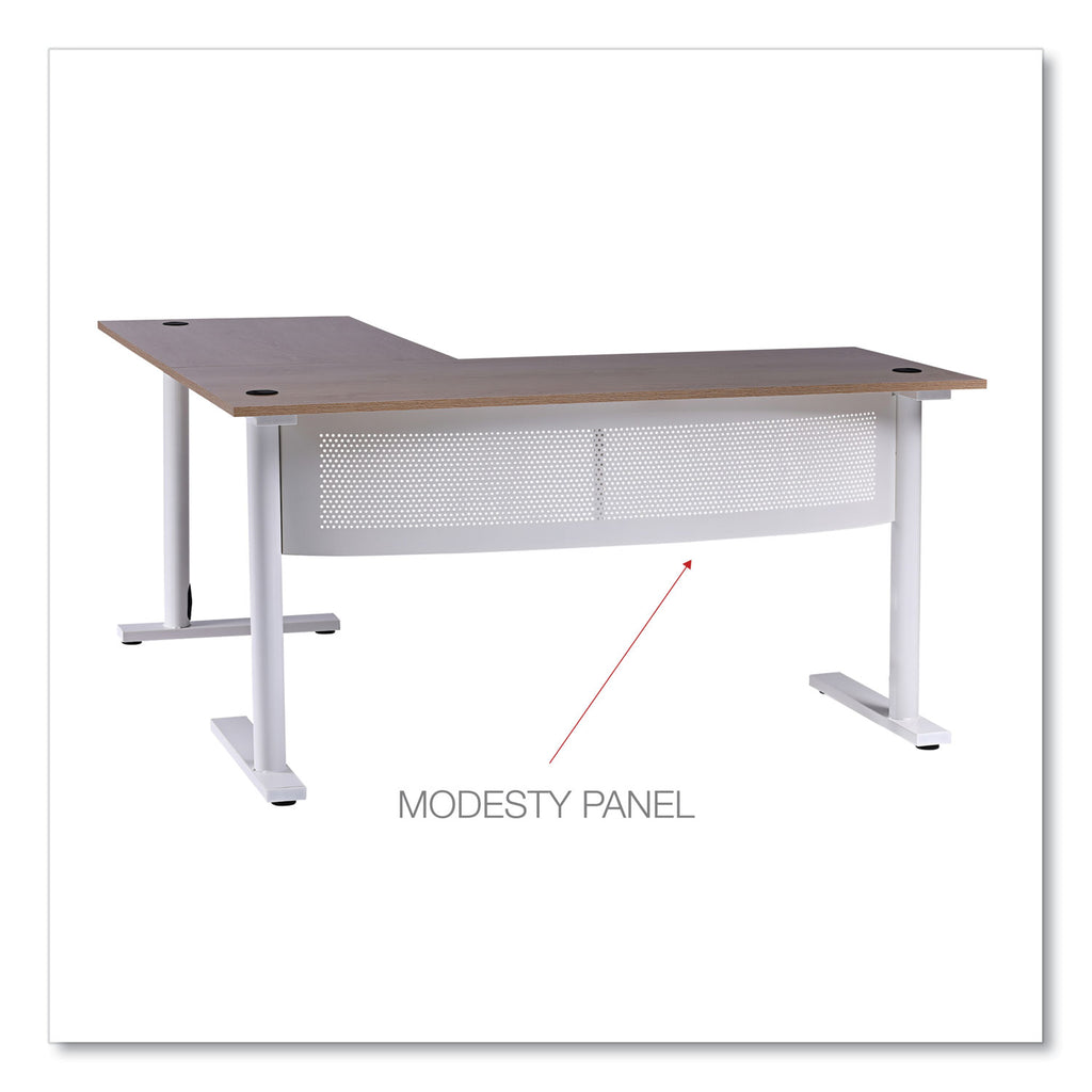 Delivering the best of both worlds, this L-shaped computer desk is both spacious and compact. The large desktop accommodates everything you need to be productive and has room to spare for displaying decorative items. The L shape is compact in footprint when placed in a corner but is finished on all sides so you can position it however you choose in a home office. Built-in cable management through legs allows for a cleaner look. Attached modesty panel for privacy if used in an office environment. The laminate wood desktop panel and metal base are sleek yet sturdy, giving this desk a modern simplicity that coordinates with most decors.