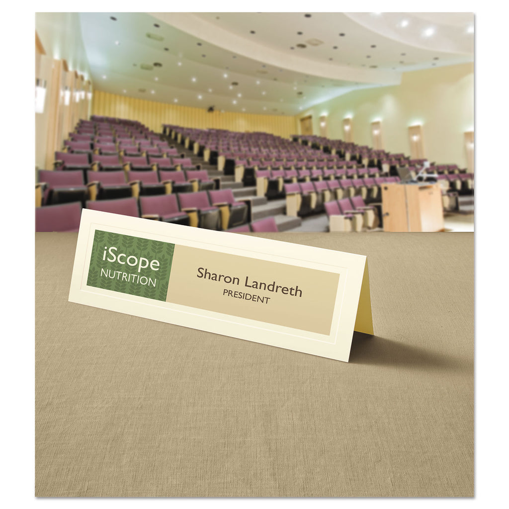 Fold-over rectangular cards sit atop any flat surface for great visibility. Card stock is ideal for name cards in meetings, presentations, seminars and classrooms. Use as place cards for marking "reserved" seating at tables, weddings, catered events or for displaying any type of communication prominently. Ultra-fine perforations let you separate cards cleanly and easily for a professional appearance and are pre-scored for easy folding. Easy to customize with free designs and templates from Avery Design & Print. 8.5" x 11" sheets for laser and inkjet printers.