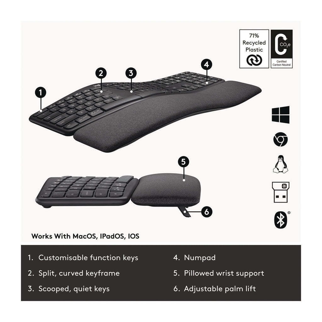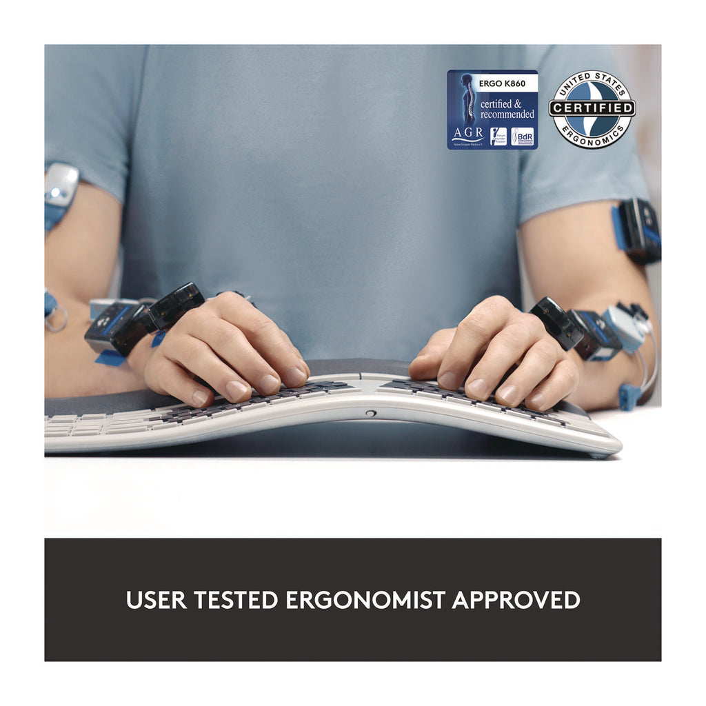 A science-driven ergonomic keyboard designed for relaxed, natural typing and hours of comfortable productivity. Type more naturally with ERGO K860, an advanced ergonomic keyboard that promotes a more relaxed typing posture—reducing wrist bending by 25% and offering 54% more wrist support. The curved, split keyframe reduces muscle strain on your wrists and forearms. And the pillowed wrist rest offers comfort and the optimal ergonomic position. The adjustable palm lift feature keeps your wrists in a natural posture, whether you're seated or standing. You'll confidently type on Perfect Stroke keys—crafted for precision and fluidity. And an integrated numpad, multi-device capabilities and two-year battery life ensure that you won't compromise performance for ergonomics.