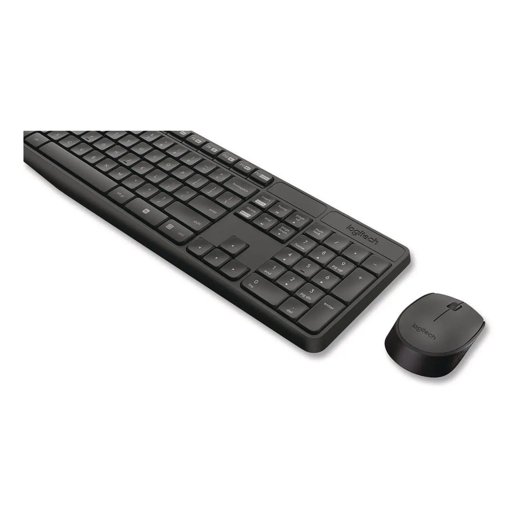Control your computer with this practical Logitech® MK235 keyboard and mouse set. The USB wireless design is easy to install so you can get to work faster, and the optical tracking on the mouse provides accurate, smooth movement. This keyboard set is made from heavy, durable materials to help it withstand busy offices and daily use, and the full-size and standard layout makes it easy to type and enter data. The mouse and keyboard come in standard black color for a professional look.