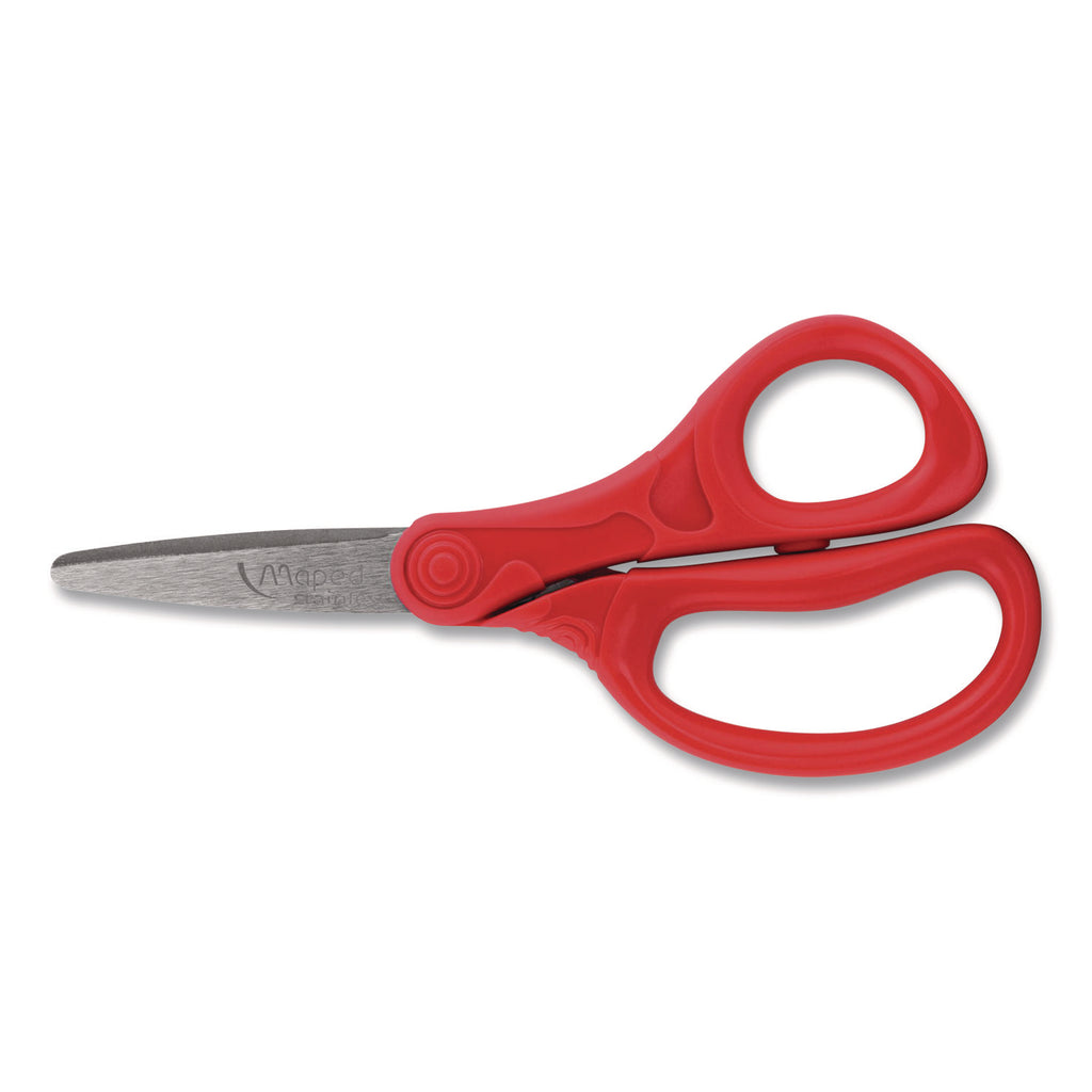 Maped Helix Essentials Kids School Scissors are perfect for young students going back to school! Modern design features pointed tip stainless steel blades with a rounded tip that is safer than others you can find on the market and are much more appropriate for young students. Eye-catching asymmetrical handles are perfect size for young hands to hold and are perfect for students six years and up. Packed in a reusable School Pack perfect for classrooms, camps, daycares and more.