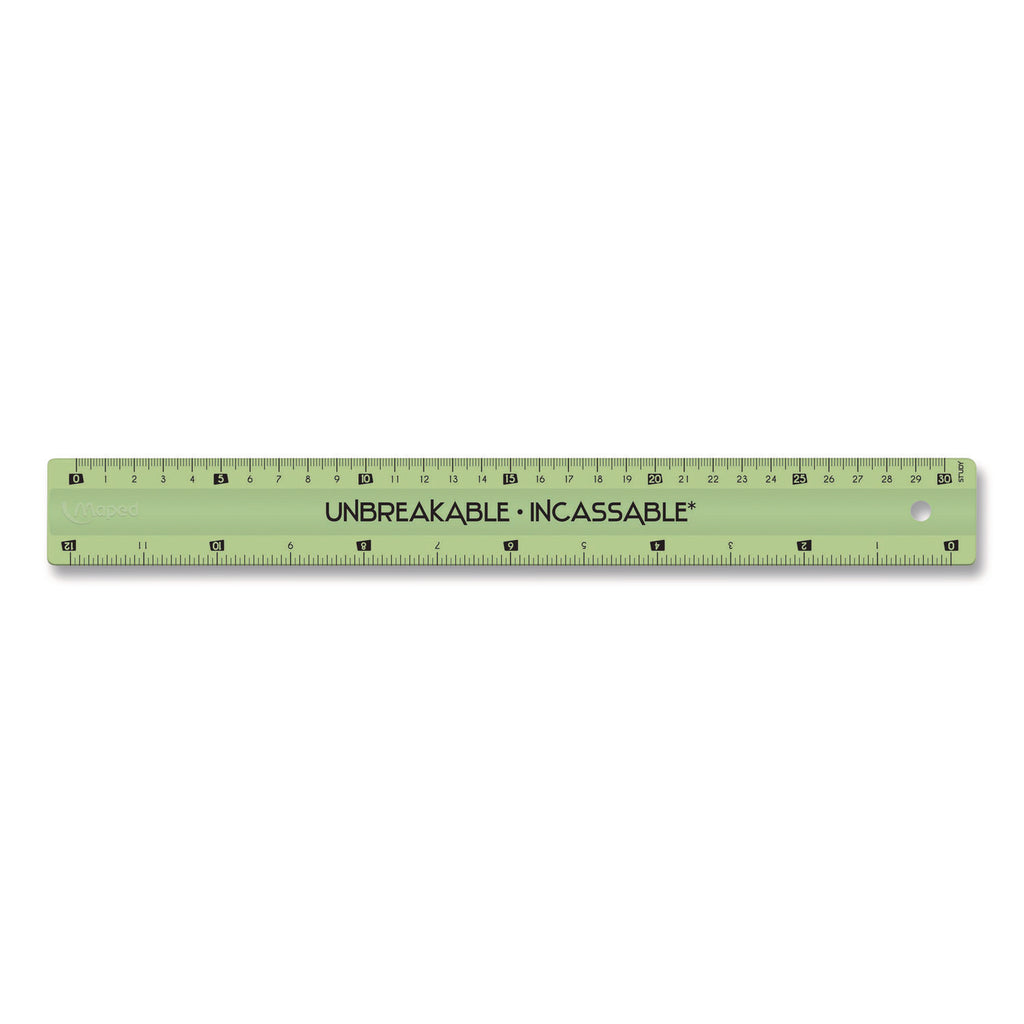 This ruler is made of a unique material that is durable enough for even the messiest classrooms, but is still light and flexible enough for even the youngest students to use. Transparent colors make it easy to see what you are measuring. Features both Standard and Metric graduations and a convenient hang hole for storage. Ruler is unbreakable under normal conditions and use.