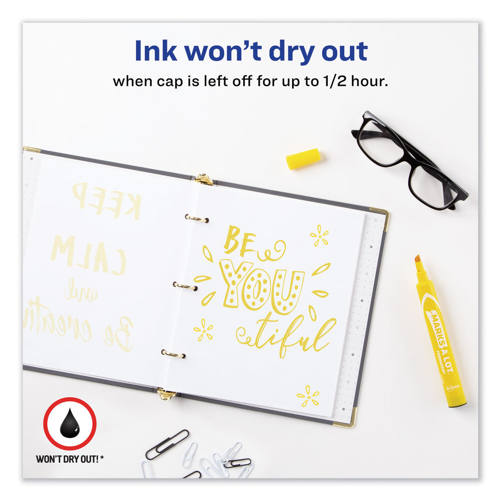 Won't dry out leave cap off up to 1/2 hour! Bold marking, permanent ink provides high visibility. Marks on virtually any surface, including cardboard, metal, and plastic. Quick drying; water and rub resistant. Durable chisel tip marks in a variety of widths. Low odor. Safe for office, school, or home.