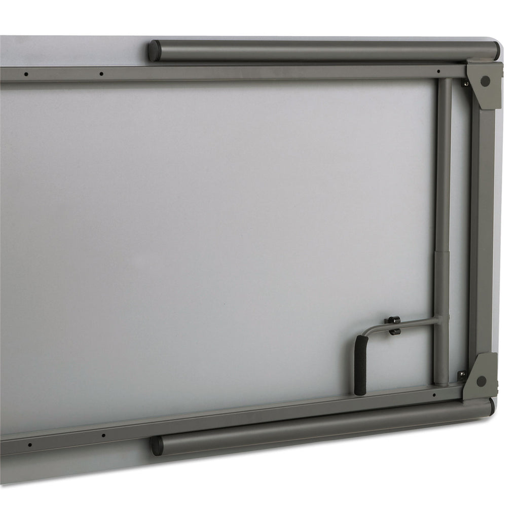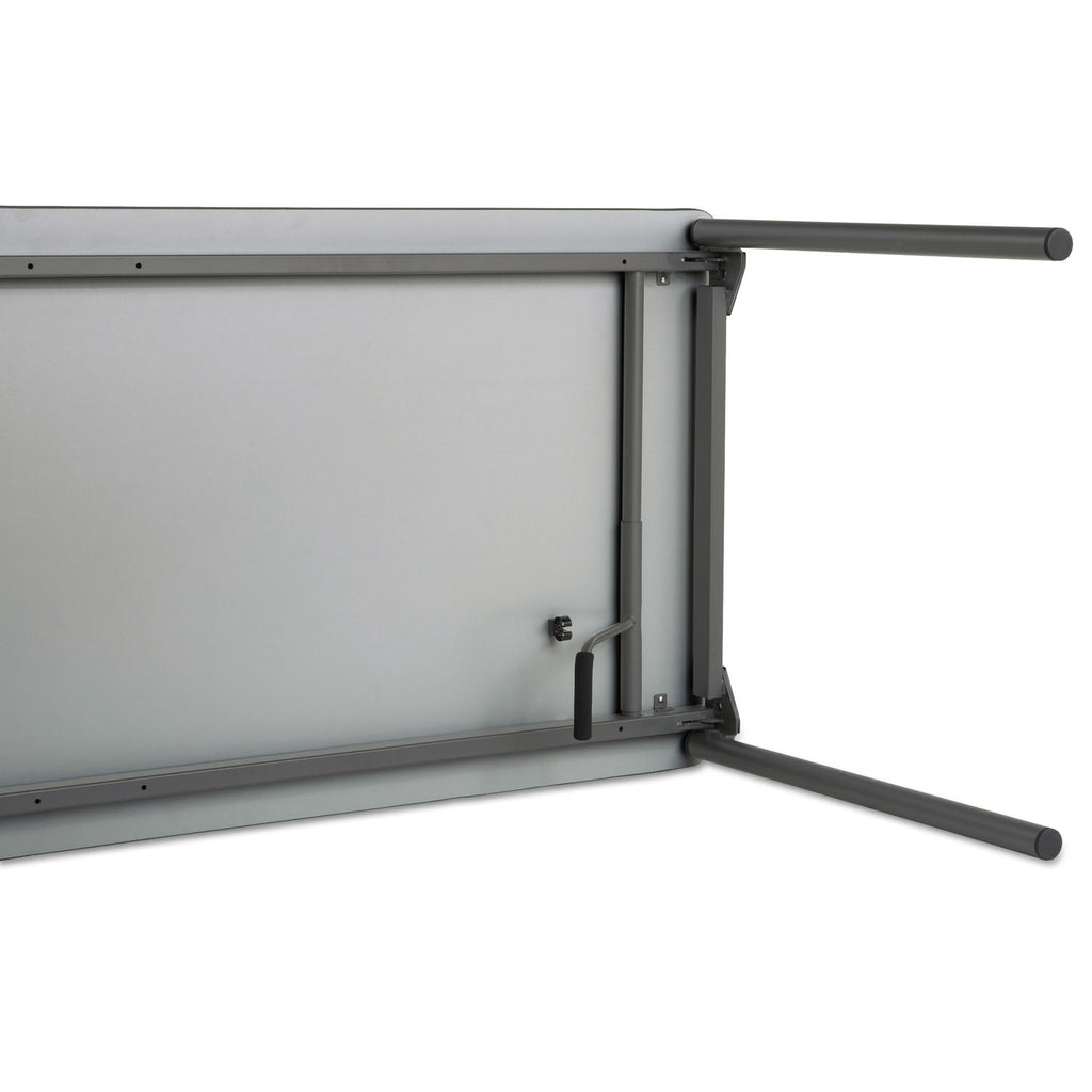 Features an open-corner leg design for maximum legroom, comfort, and seating capacity. Ideal for all commercial applications. The single-cam, quick-release lever makes setup and takedown easy and efficient. Heavy-duty 1-1/2" powder-coated legs fold into underside for compact storage. Melamine T-Mold top resists wear and moisture, while bumpers help protect the table when in use or stored. Non-mar feet protects flooring.