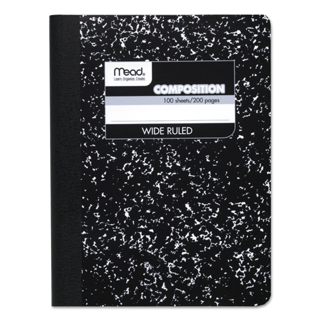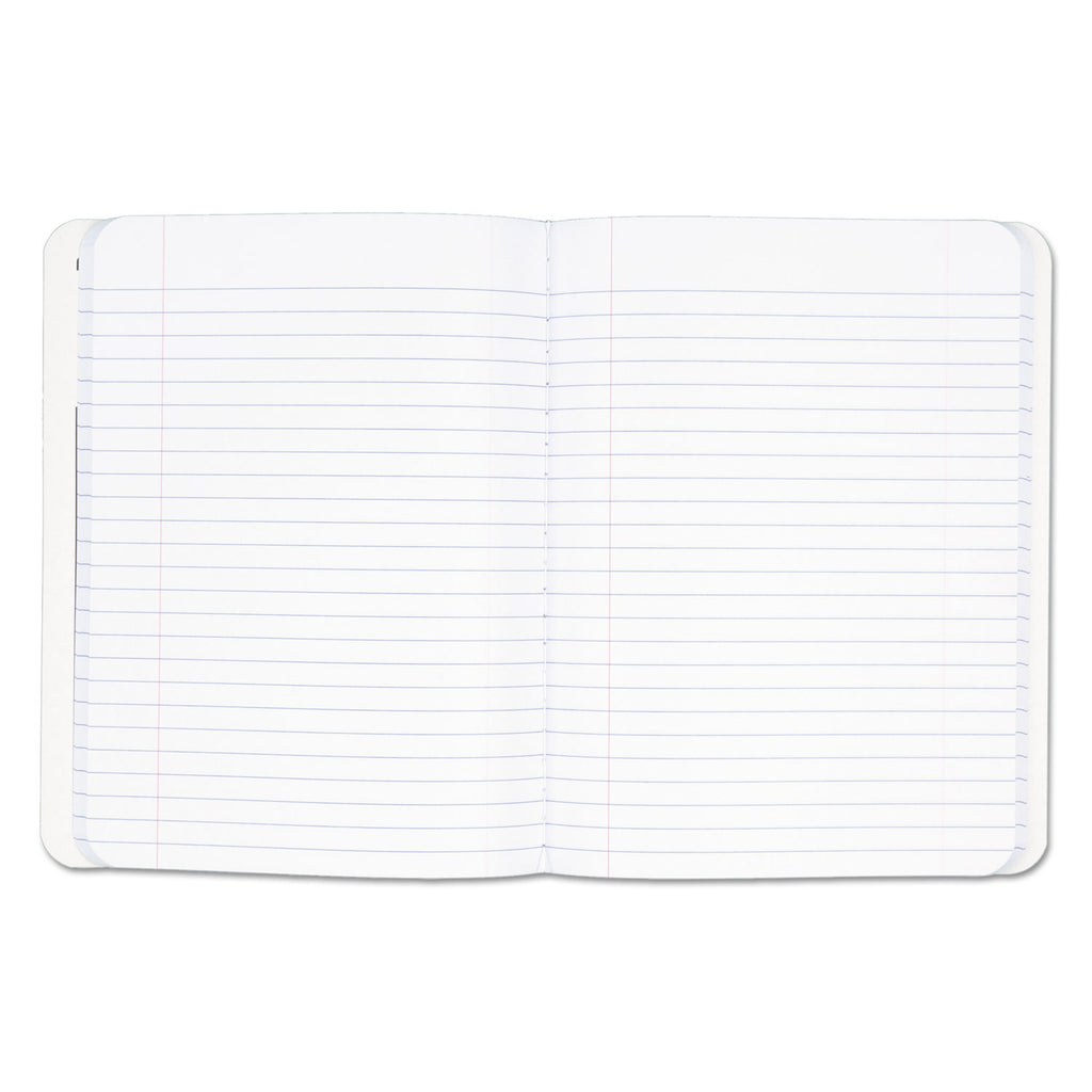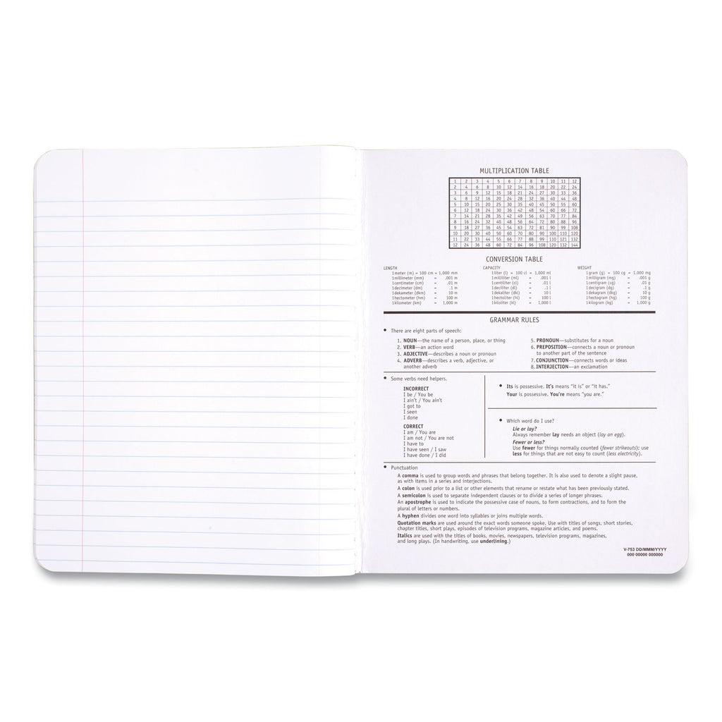 Durable cover with nameplate that allows you to name or number each notebook. Secure sewn binding. Class schedule grid on inside front cover. Multiplication table, conversion table and grammar rules on inside back cover. Black marble.