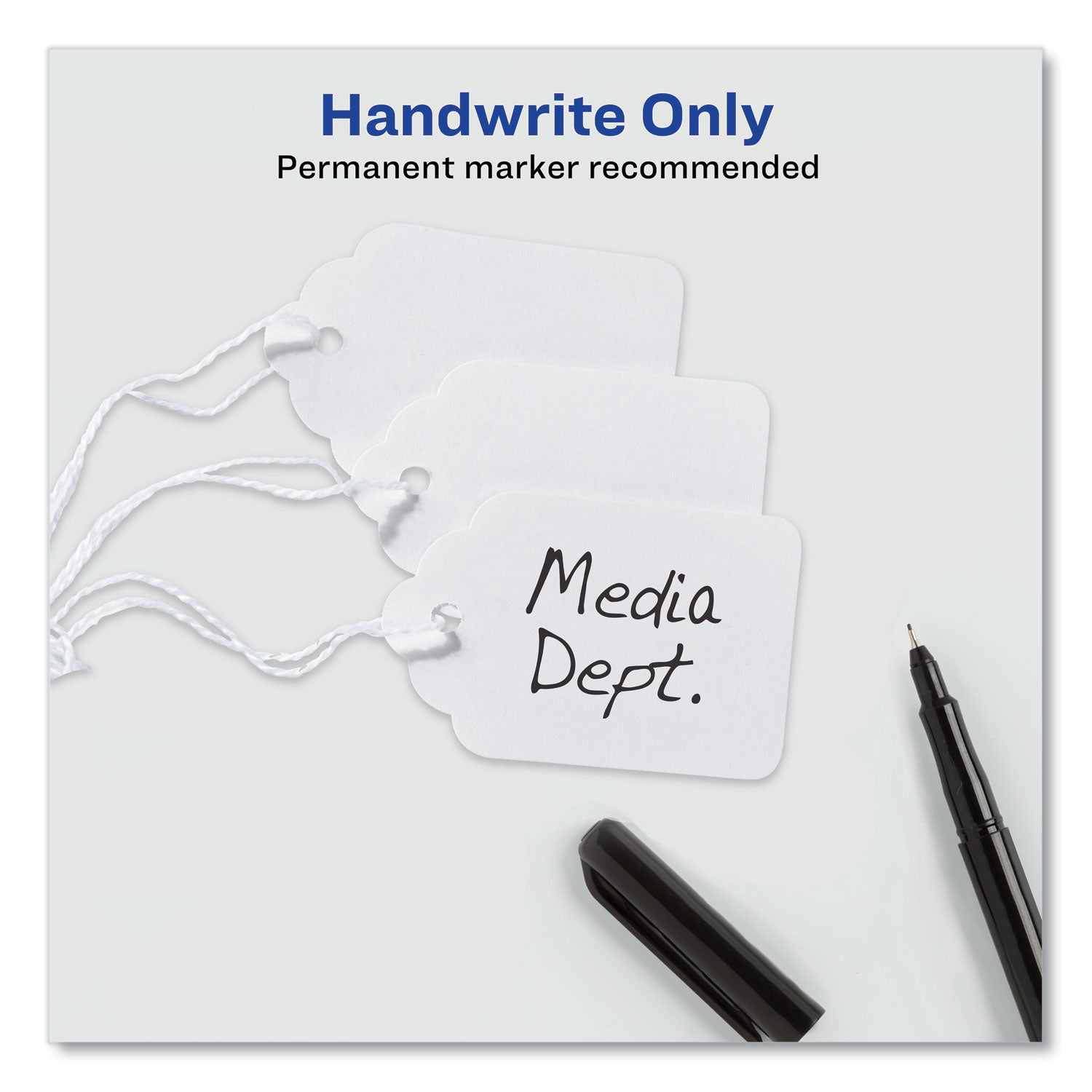 Excellent quality. Made of medium weight stock. Strung with white cotton polyester twine, knotted at end. Smooth writing surface. Packaged in a convenient, reusable storage container.