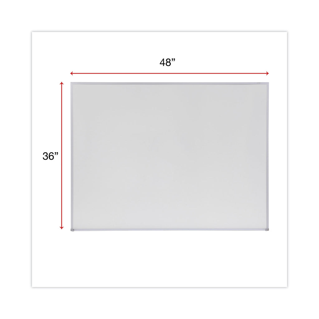 Aluminum framed, sleek and modern melamine board that's built with added strength and durability. The writing space is encompassed with a simple, classic, slim-line frame design that fits in with any office or workspace. The smooth, melamine surface is great for meetings and presentations. Full length integrated maker tray. Mounts horizontally with included hardware. Dry erase markers and eraser are sold separately.