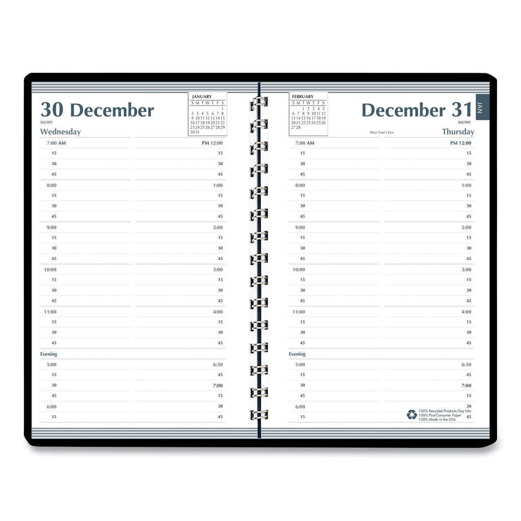 Includes printed monthly indicators to quickly find the date you need. Quarter-hourly appointment increments. Includes a double-sided storage pocket. Durable black embossed simulated leather cover. Made entirely of recycled materials.