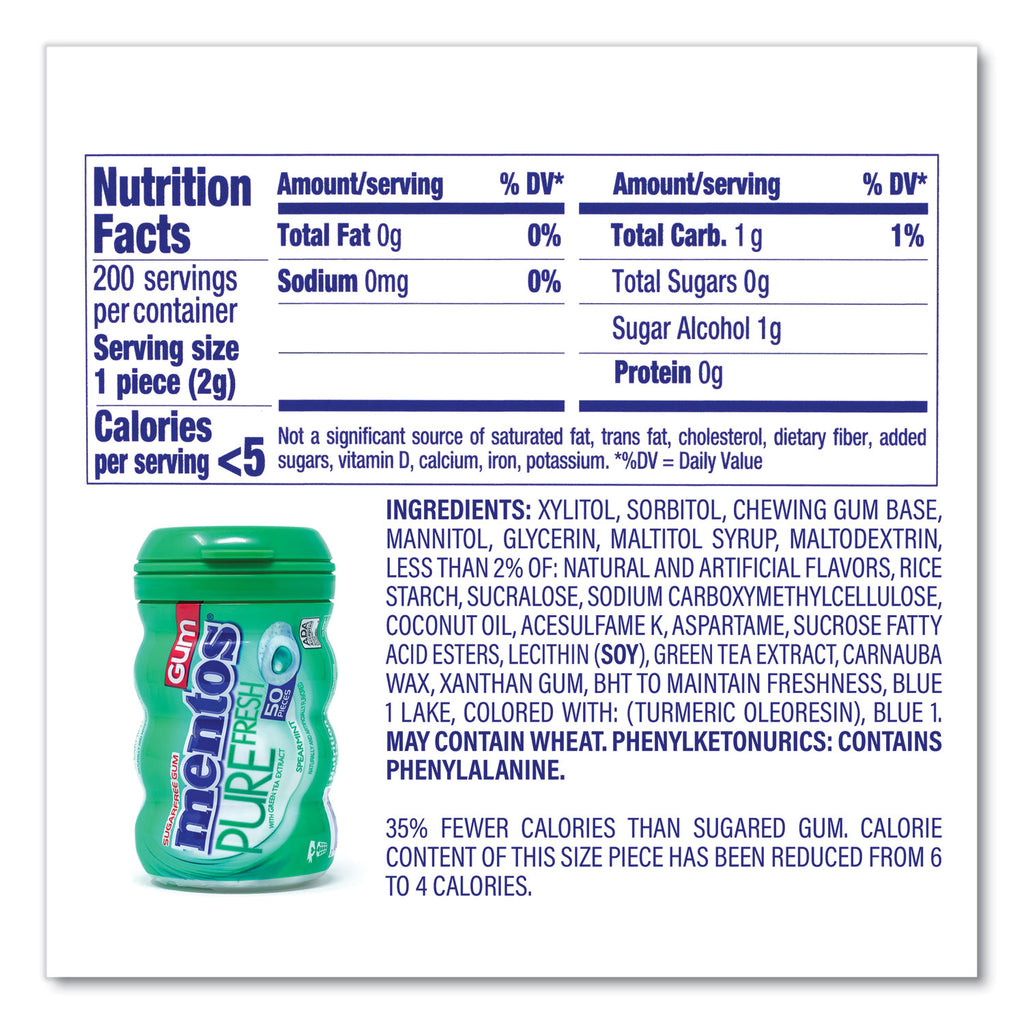 Have a fresh day with Mentos Pure Fresh Spearmint and Fresh Mint flavored chewing gum. Each piece of this sugar-free, mint flavored gum gives you a blast of fresh flavor that lasts chew after chew. Mentos curvy bottle is perfect to keep at your desk, in your car, at home or anywhere you may want some freshness! With 50 pieces per bottle, make fresh connections by sharing or keep all the freshness to yourself.