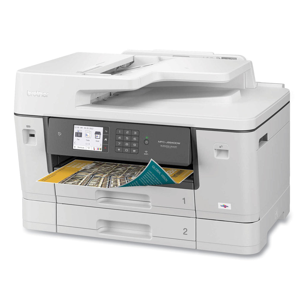 The Brother MFC-J6940DW color inkjet all-in-one printer delivers the functionality your office needs for optimum business performance. Print professional quality text and graphic documents at print speeds up to 28 ppm (black and color). A smart choice for businesses that need a printer to handle mixed media sizes; two 250-sheet capacity paper trays offer flexibility to print, copy, scan and fax on paper up to 11" x 17" (Ledger) size. Raising the bar with single-pass duplex copy and scan functionality. Use convenient NFC mobile printing or access features on the go with the free Brother Mobile Connect App. Whether you print a little or a lot, the convenient Brother Refresh EZ Print Subscription Service erases the worry of running out of ink. The Brother MFC-J6940DW color inkjet All-in-One printer offers reliable, professional-quality printing for any small work group or small business.