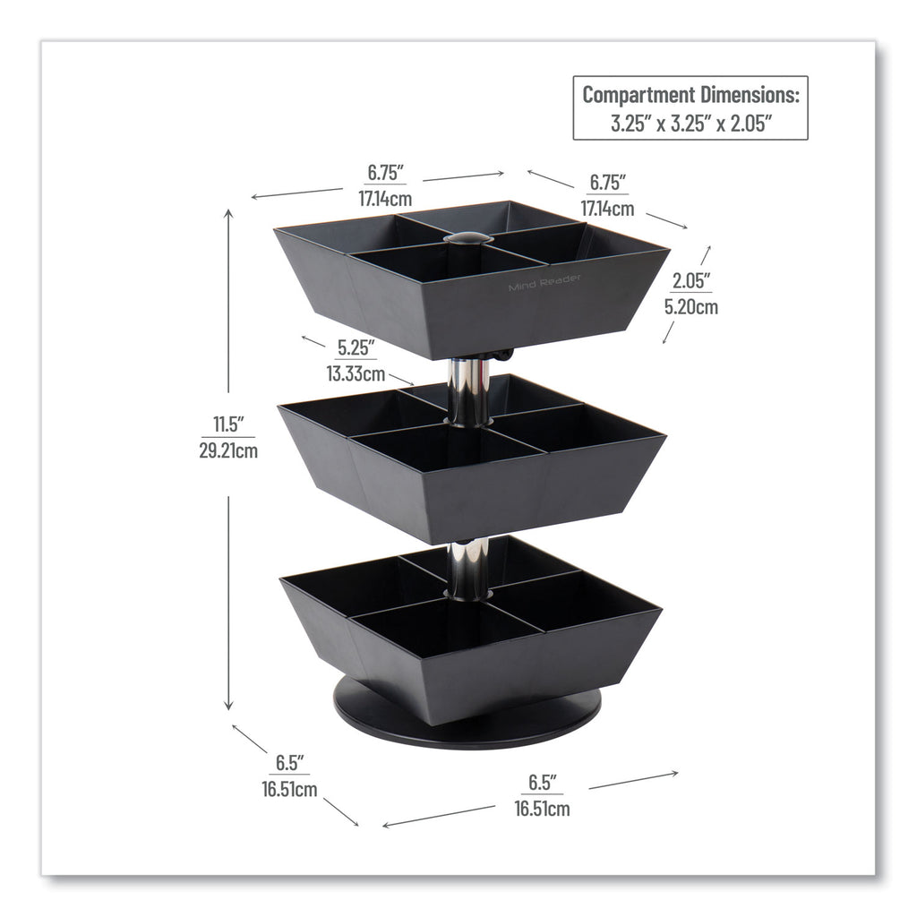 Tea time at your fingertips. Remove the chore of digging through tea boxes and pouches for your favorite pick-me-up cup of warmth with the convenient 12-compartments available in this tea carousel. Separate the green tea from the black tea and give decaf options their own space. Alternatively, save one of the tiers for your packets of honey, sugar, creamer, or lemon. Each of the three tiers is only 2.05 inches tall. You can easily pick it up and move it around your home or office kitchen. It's also a great addition to a hotel or restaurant coffee bar. The tiers are black and blend in with most kitchen decor. The carousel spins around so you can easily turn the tiers to find what you're looking for. Cleaning the carousel is easy with a wet cloth and mild soap. Perfect for your office and home kitchen. It's also a thoughtful housewarming present paired with your favorite teas and condiments!