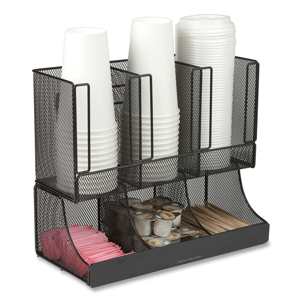 - Use this cup and condiment organizer to store cups, lids, and coffee/tea accessories, or use the compartments for other condiments.