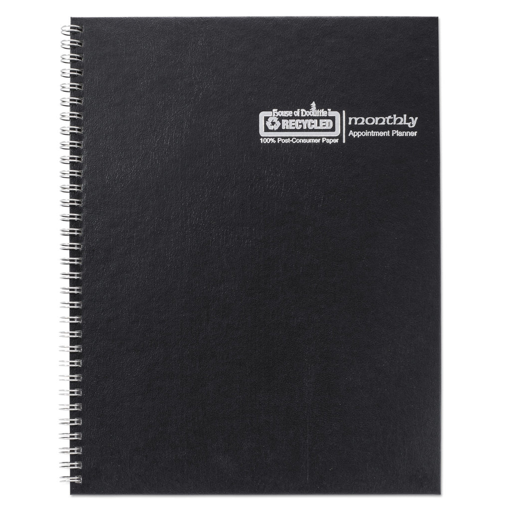 Monthly planner with a durable hard cover that folds over to create a sturdy writing surface. Includes a double-sided storage pocket. The planner is bound strongly with wire binding to withstand daily use throughout the year. Previous and future reference months on each two-page spread. Made entirely of recycled materials.