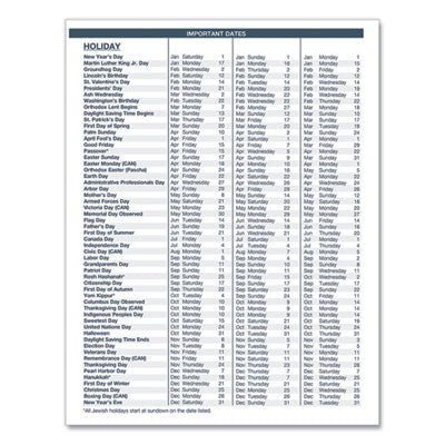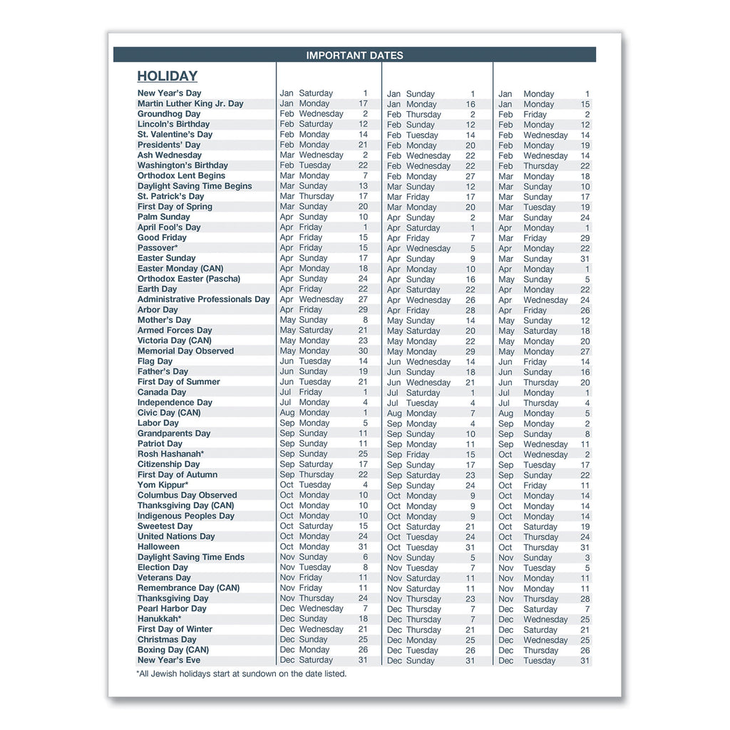 - Additional page features important holiday dates for three years in list form.