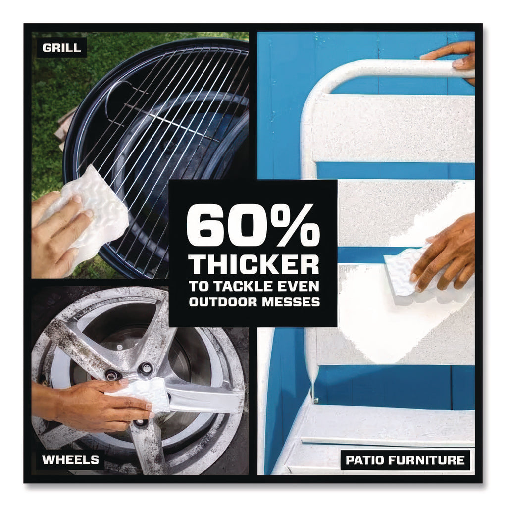 The Mr. Clean Magic Eraser Ultra Thick multi-surface cleaner lasts seven times longer than the Original Magic Eraser: no more sponges or other cleaning products needed. Just wet, squeeze, and erase over 150 messes with ease. The heavy-duty cleaning micro-scrubbers reach deep into surface grooves, lifting away built-up dirt and grime. The Magic Eraser Ultra Thick is an all-purpose cleaner that tackles tough messes all over your house, inside and out. Use it as a bathroom cleaner on soap scum, tub rings, and water spots. Use it in your kitchen on permanent marker stains, greasy counters, and grimy stovetops. Use it outdoors on grill grates and patio furniture. Also makes a great shoe cleaner and wall cleaner. Add the Magic Eraser Ultra Thick cleaner to your arsenal of cleaning supplies today.