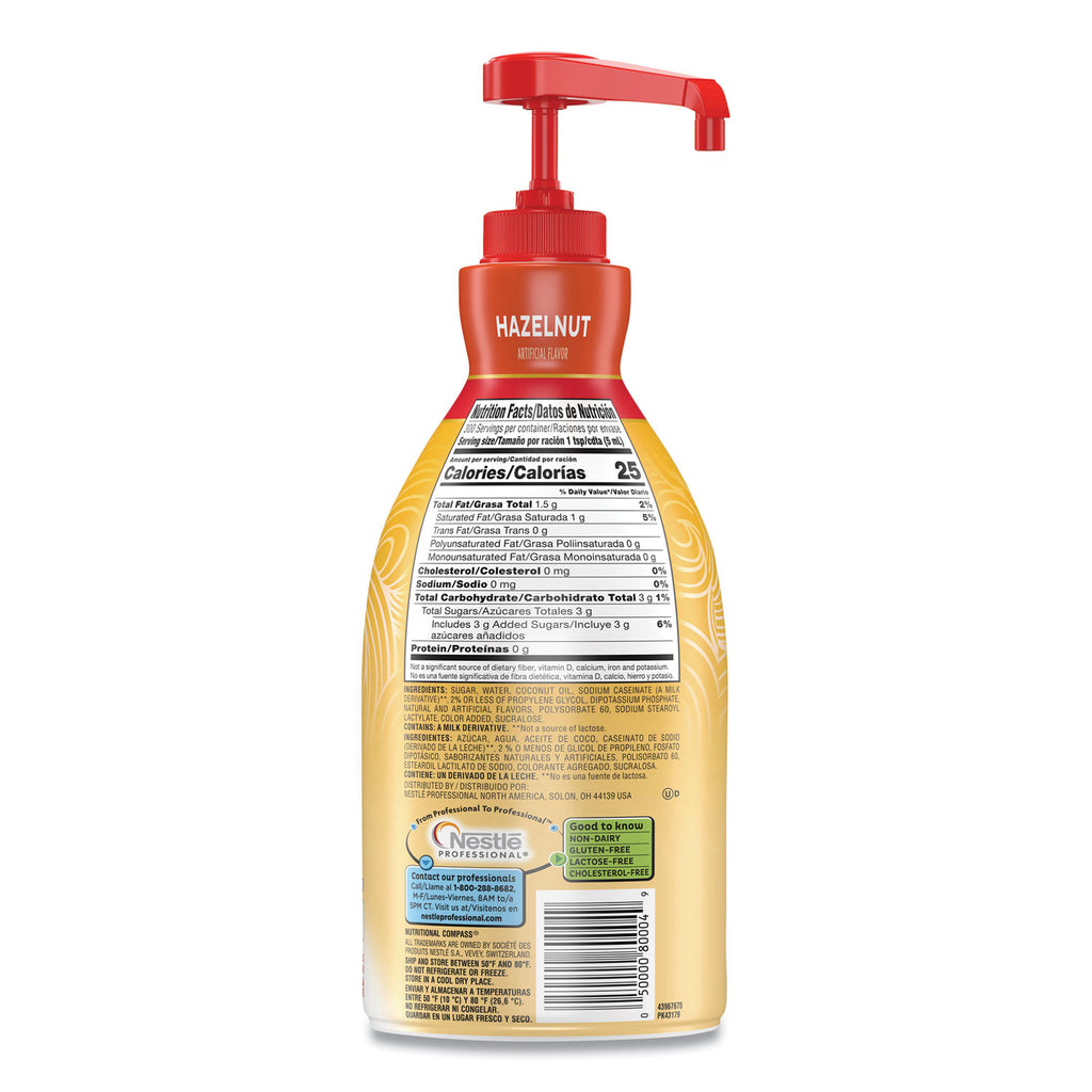 Non-dairy coffee creamer is now available in a convenient, easy-to-use pump dispenser that eliminates mess. One pump gives you the same amount of delicious Coffee-mate® Liquid Coffee Creamer as one small tub. Pump is non-removable once installed for food safety. 300 liquid creamer servings per bottle. Lactose-free, Kosher dairy, cholesterol-free and shelf-stable.