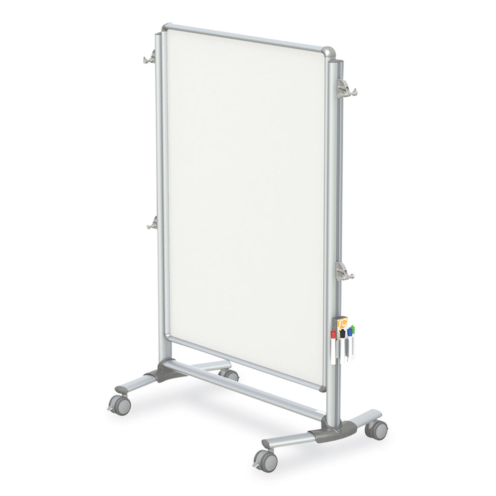 Movable display panel provides flexibility to create temporary walls. Partition features a double-sided magnetic whiteboard surface for a reusable and greener solution than traditional chart pads. Presentation options are expandable with side pegs that accommodate up to four tablets (sold separately). The angled foot design allows for easy grouping. Units come complete with four markers, one eraser and a side-mountable holder.