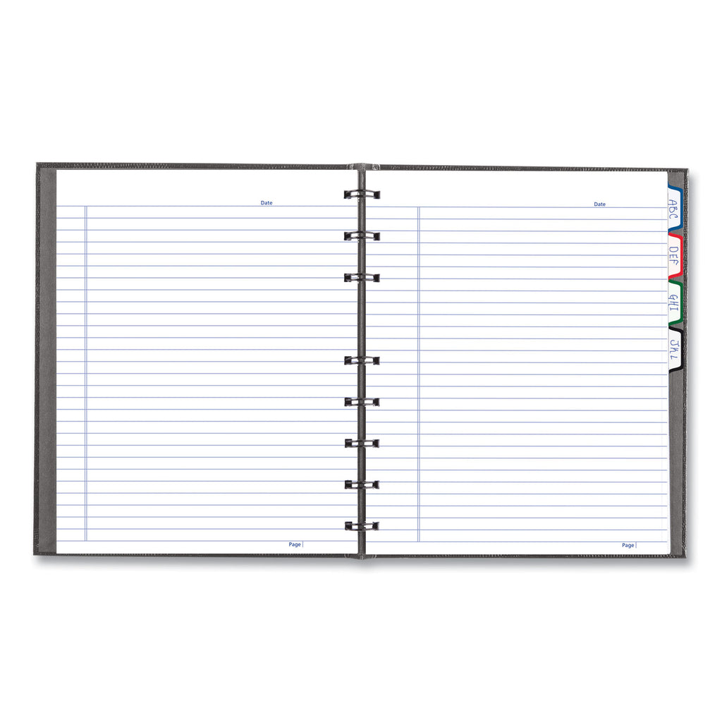 Take notes like a pro. Hardcover notebook features twin-wire binding, a lizard-look cover pattern and an abbreviated note-taking format with space for date, title and page number. Colored, self-stick tabs and labeling stickers allow you to customize an index and draw extra attention to important notes. Easy-tear, microperforated, archive-safe pages.