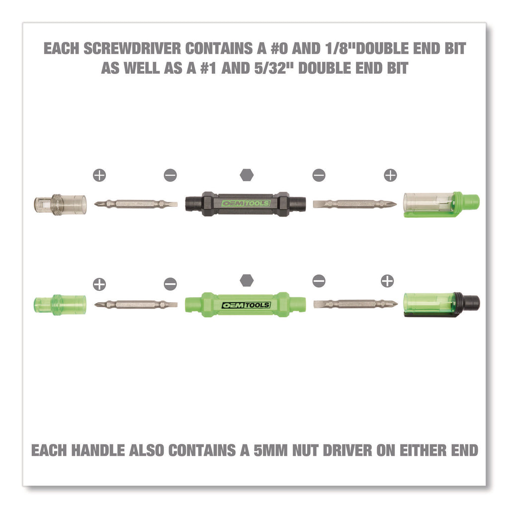 6-in-1 tool is the epitome of convenience. Each pocket-clip equipped, pen-like tool features two double-ended Phillips/slotted bits (#0 & 1/8", #1 and 5/32") and two 5 mm nut drivers. Small and lightweight, it's perfect for detail jobs. Bits store neatly within the barrel-like handle.