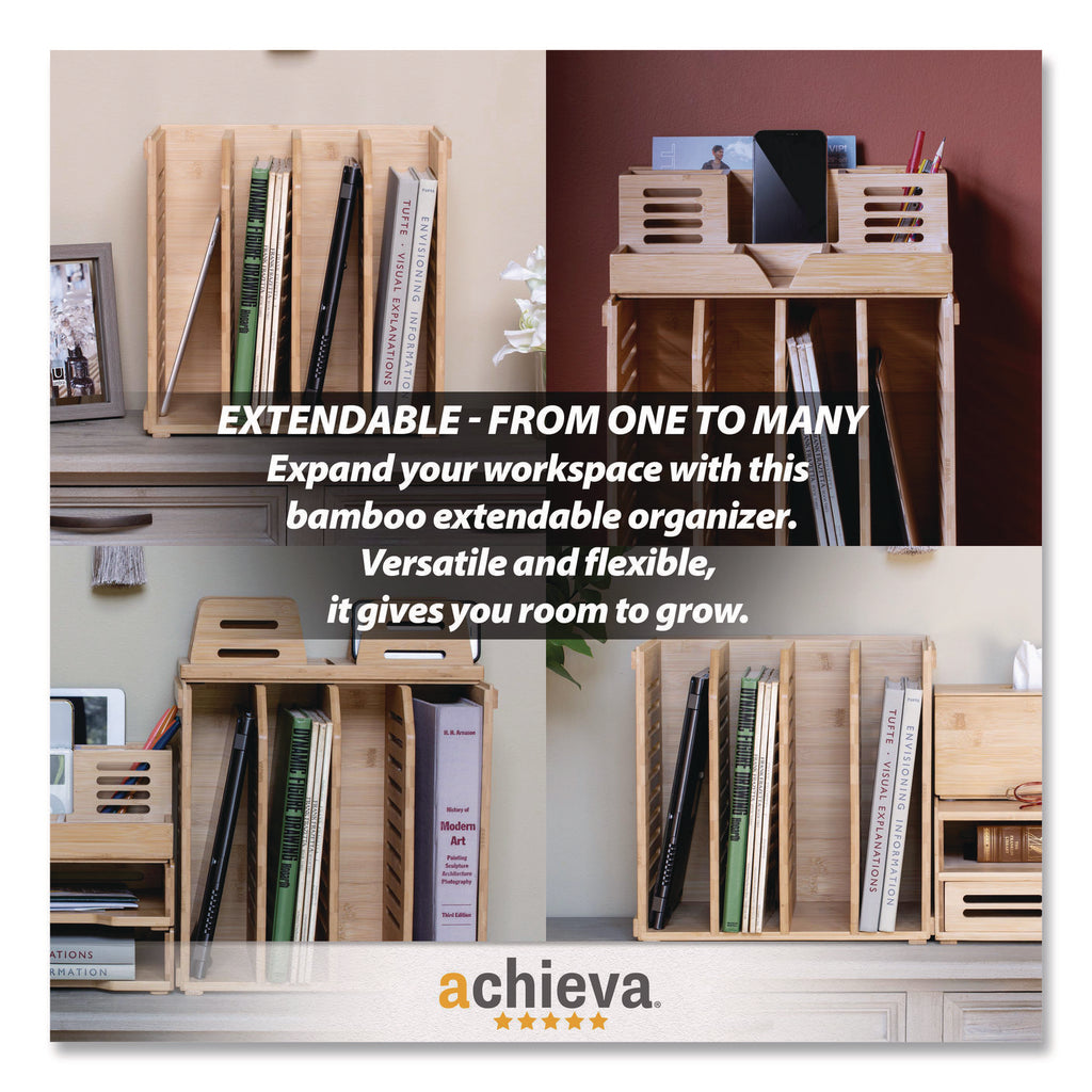 The Officemate Bamboo Desk Organizer features seven storage compartments for organization of all desk supplies. Organizer can hold files, pens, pencils, and a variety of items of all sizes. High quality, sustainable, bamboo construction makes it the perfect and stylish solution to any desk or workstation.