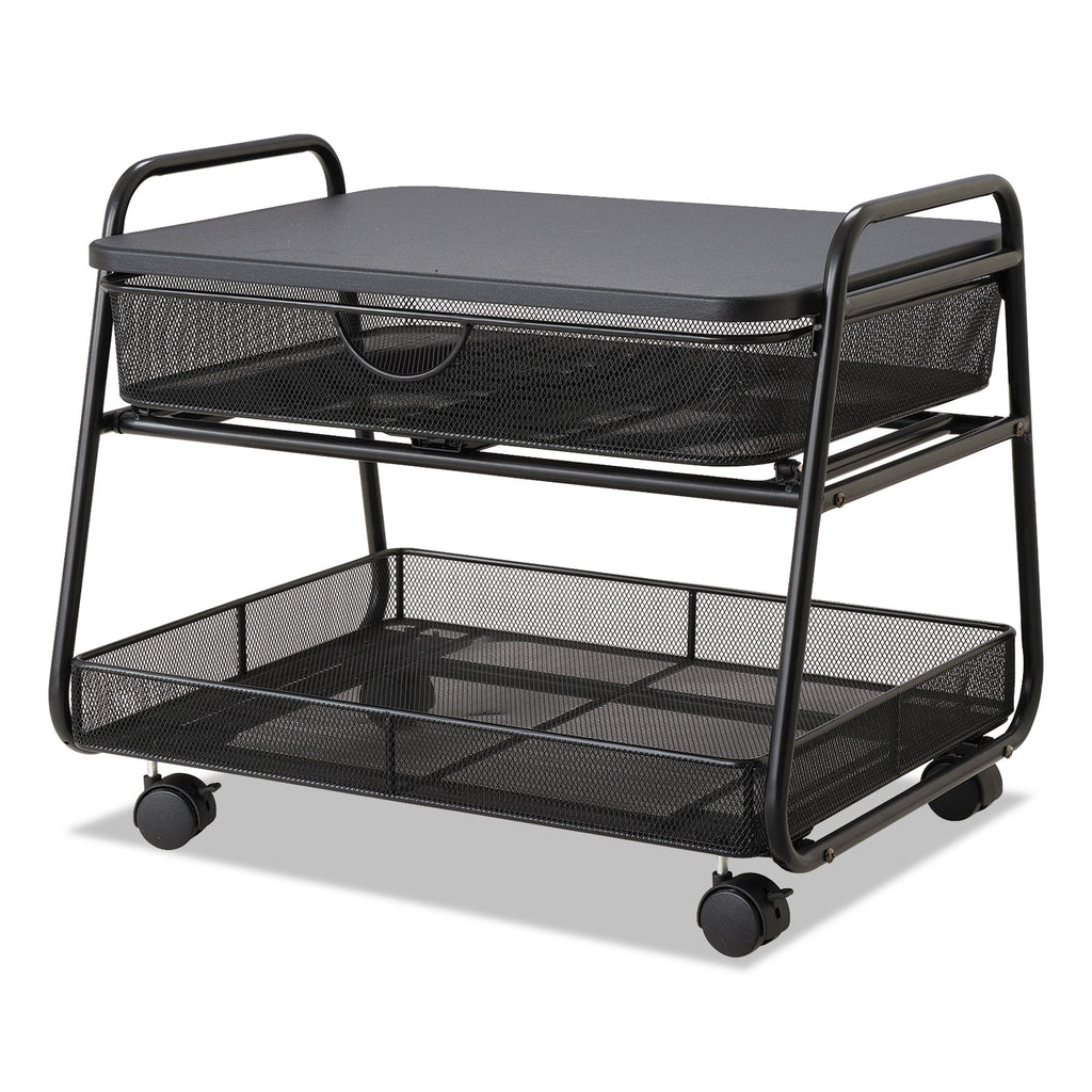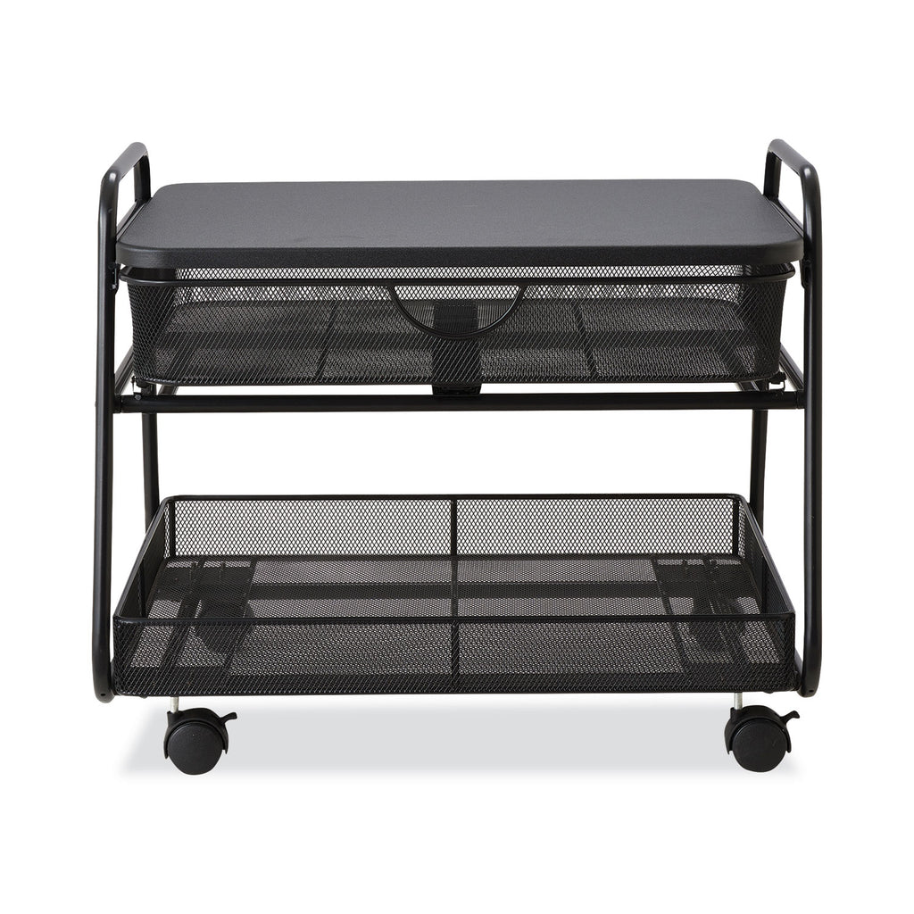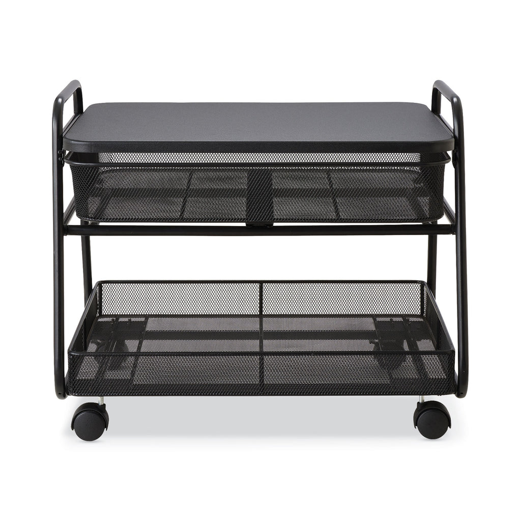 - Steel frame with wood laminate shelf and shelf with mesh baskets for storage of printers, fax machines, files or other supplies.