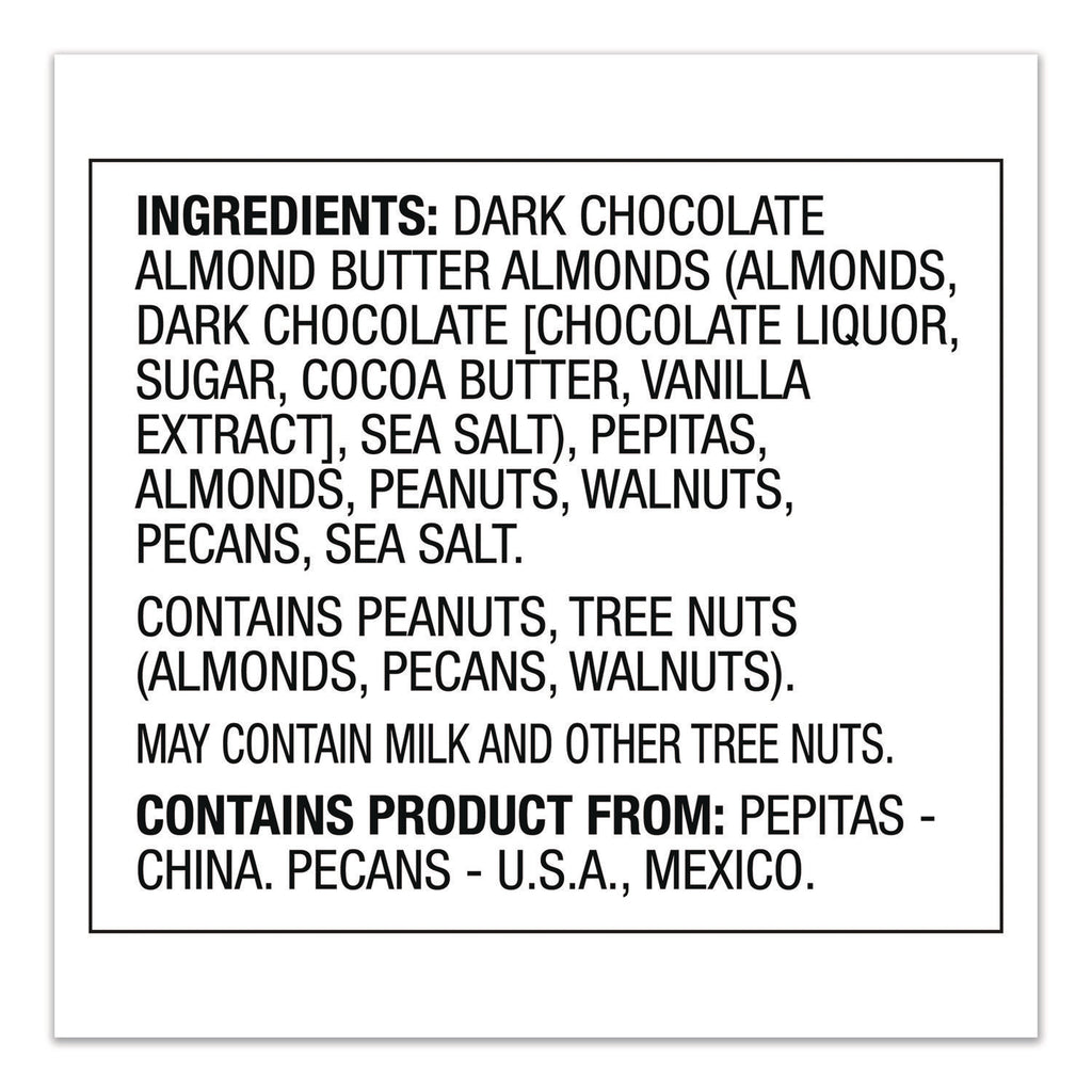 - Trail mix with dark chocolate almond butter almonds, pepitas, almonds, peanuts, walnuts and pecans.