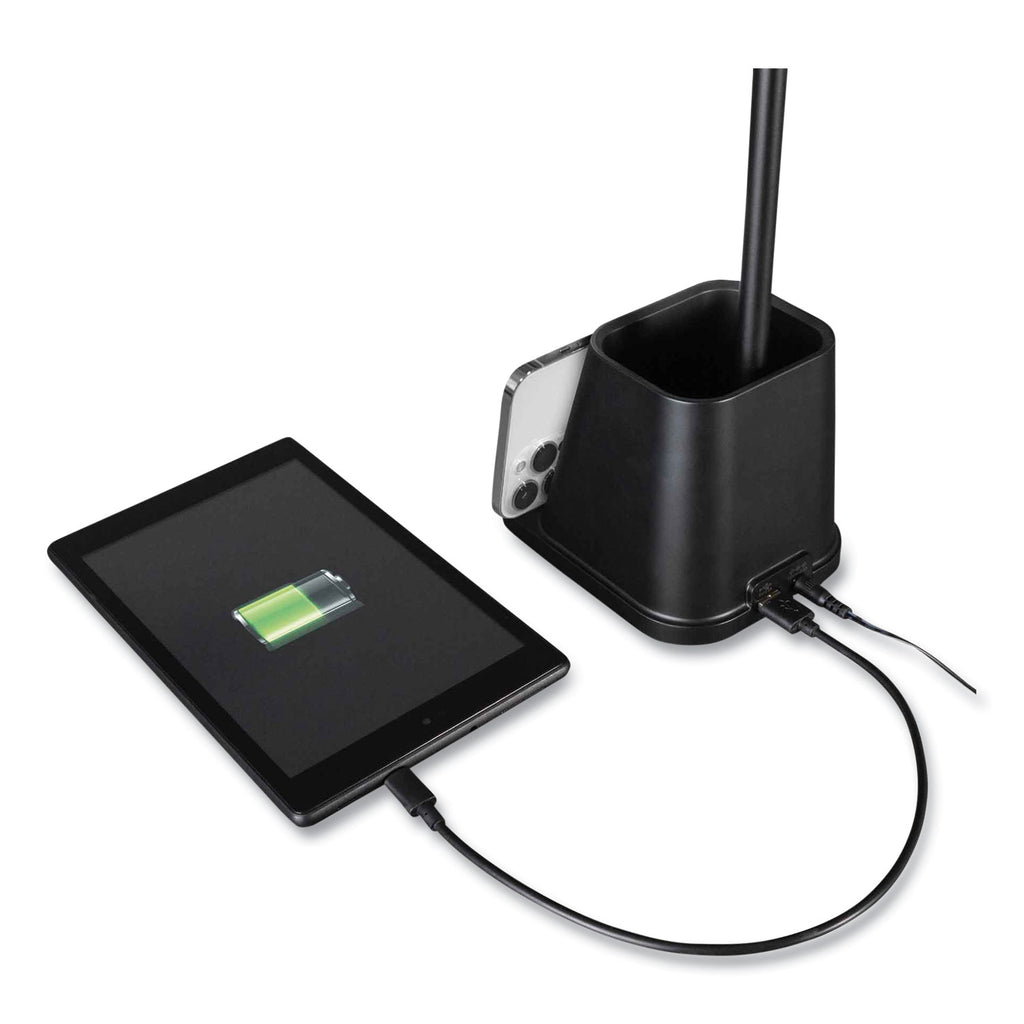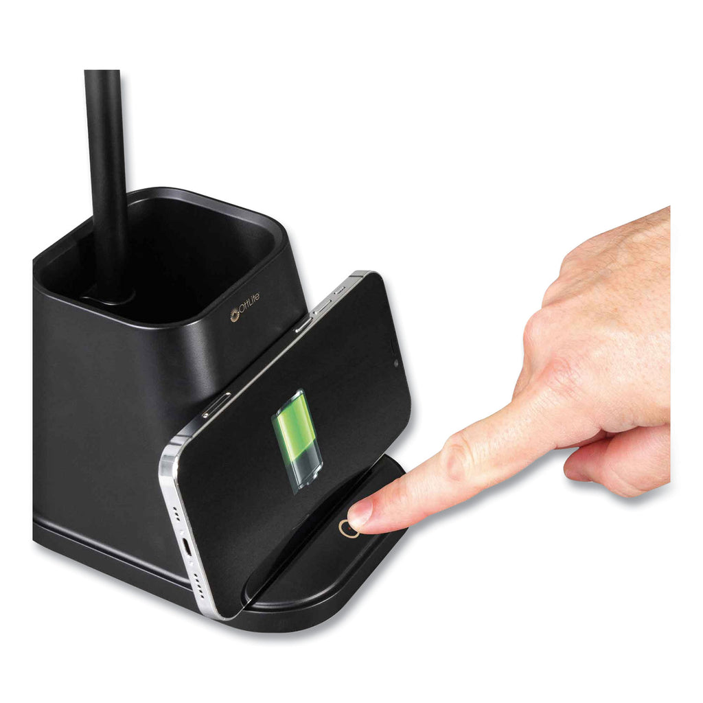 A beautiful merger of stylish organization, visual clarity and charging power, this LED desk lamp brings mid-century modern design to a new level. Part of the OttLite Wellness Series, this feature-packed lamp helps reduce eyestrain with next generation ClearSun LED technology for crisp, clear illumination--shown to reduce eyestrain by up to 51%. Fully customizable, choose from three color temperatures (warm light, bright white and ClearSun® natural daylight), control the brightness settings and adjust the lamp shade to direct light right where you need it. Plus, charge two devices at once using the wireless charging stand for Qi-enabled devices and the 5V, 2.1A USB port for phones, tablets, earphones and more. And, keep your key supplies close by with the organization compartment.