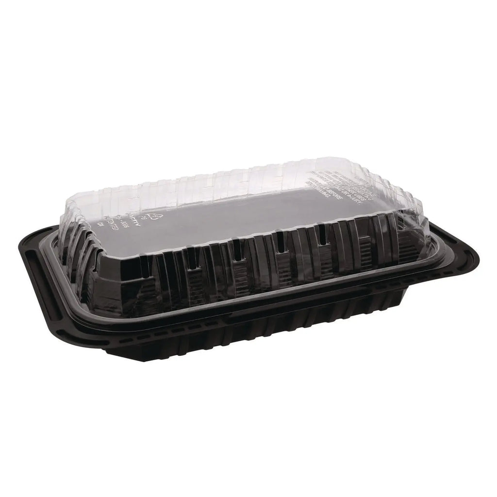 Designed to hold hot fried foods with breading, These chicken barns are equipped with a built-in venting system which allows steam to vent minimizing any condensation on the lid for superior merchandising while ensuring that crispy food stays crisp from the store to the consumers' door. In addition, the unique dimpling pattern on the microwaveable base helps to trap any grease so that it doesn't come in contact with the food. Maximize hot case impulse sales by using this exceptional packaging!