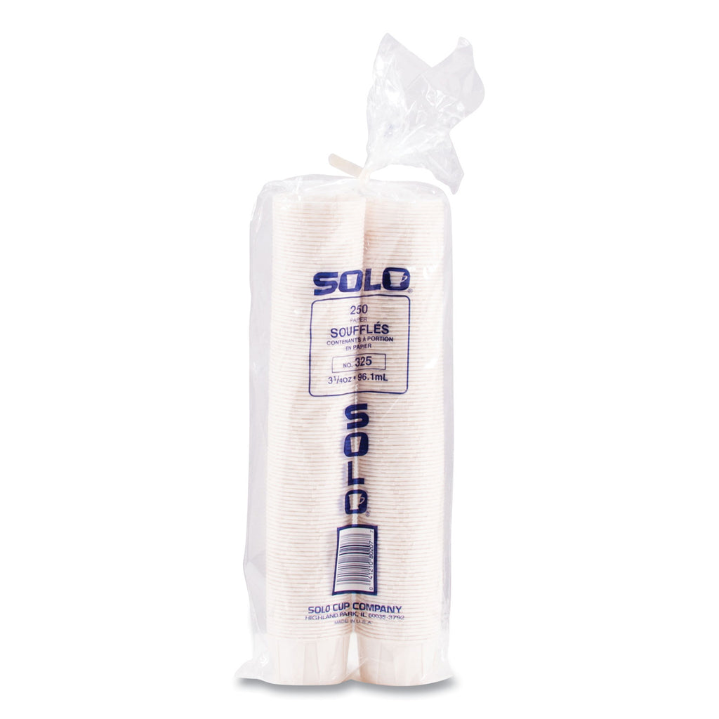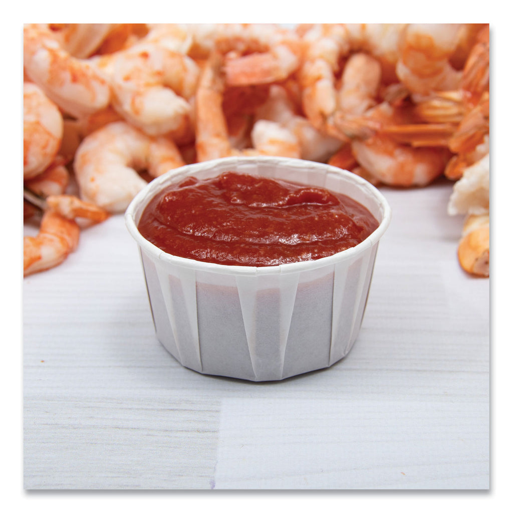 Treated, heavy-duty, multi-pleated paper cups hold up well against liquids. Rolled-wax rim maintains shape and tightness even when wet. Perfect for small servings of sauces and dressings—on premise.