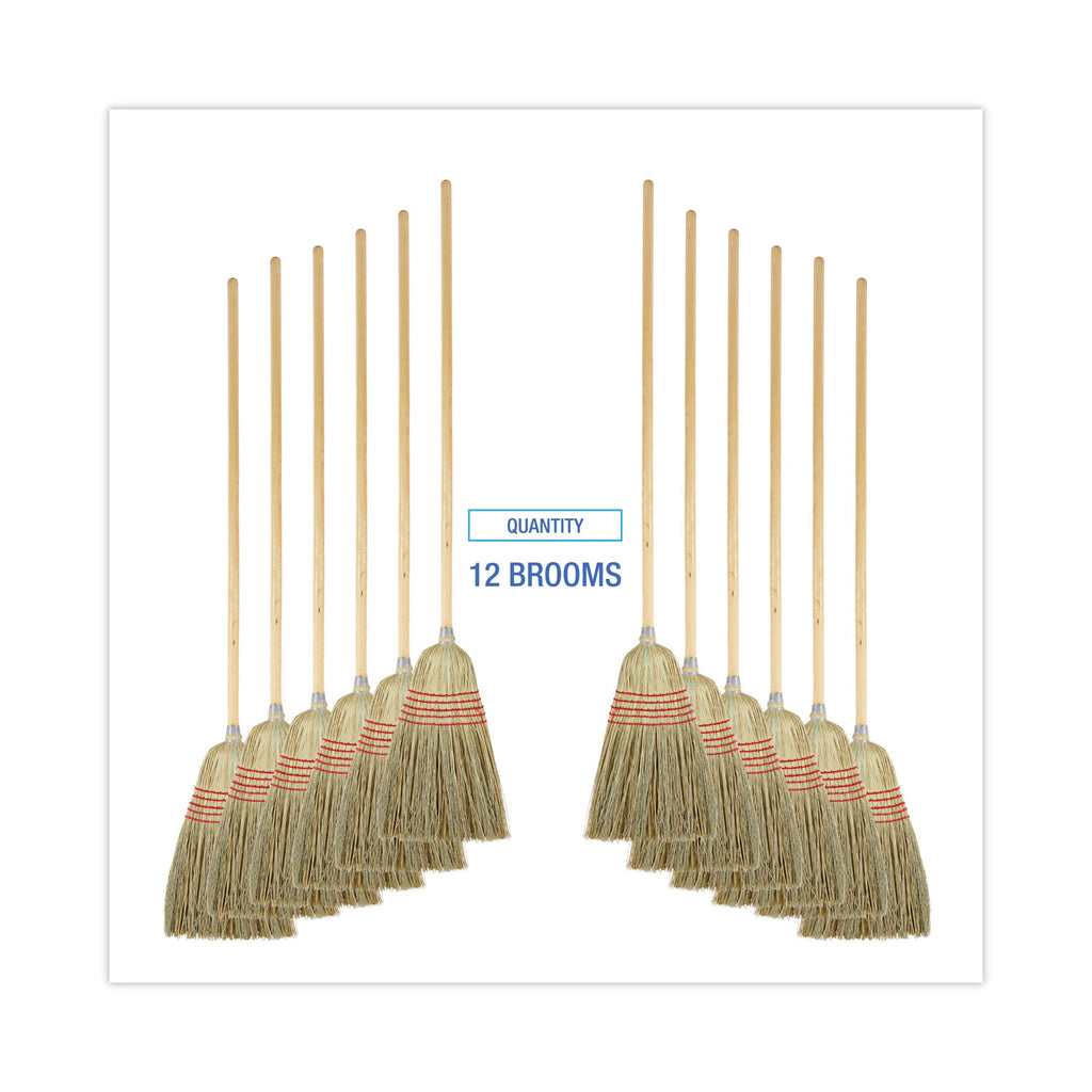 Convenient parlor broom that's ideal for light-duty sweeping on hard floors. Constructed with stiff, natural, corn fiber bristles that are tightly secured to the handle with metal wire. An ideal, sturdy broom for sweeping concrete and other rough floor surfaces. Solid wood handle that's lacquered to prevent splintering and blistering. Five rows of stitching provide added durability for lasting use.