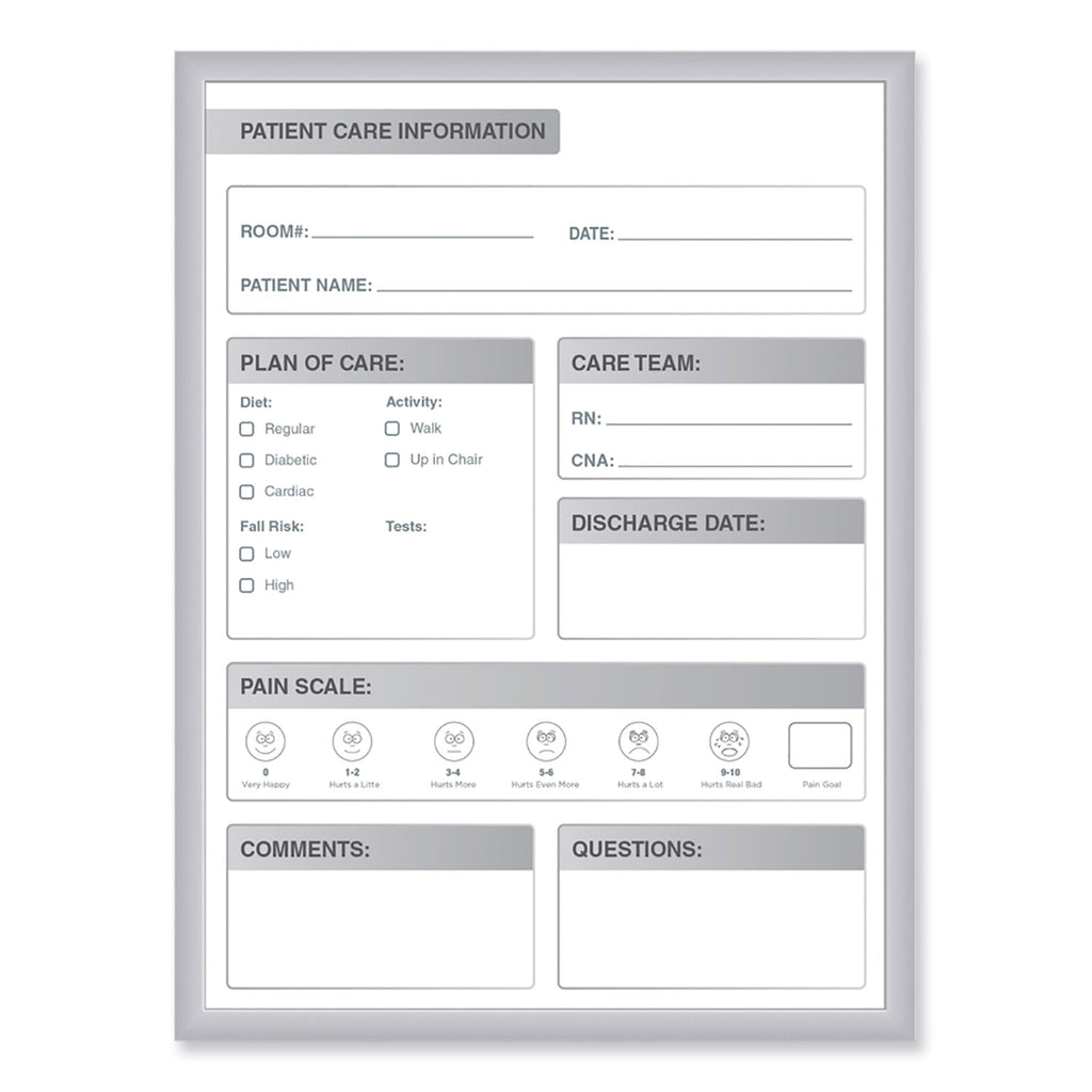 Patient room whiteboard is visually enhanced and will not ghost or stain. Soft gray graphics blend with hospital design and the researched design encourages patient and staff communication, effective in increasing HCHAPS scores and reducing patient anxiety. There is plenty of room to write in each patient's procedure details. The graphics improve communication and reduce anxiety for patients and employees. The entire dry-erase surface easily wipes off with a soft cloth, disinfectant wipe, alcohol or water. These whiteboards are resistant to bacteria and germs, which helps with infection prevention. Each board comes in a sleek 0.25 aluminum frame and includes a detached SmartPak tray. Ships to you in Ghent's worry-free packaging, designed specifically for shipping whiteboards.