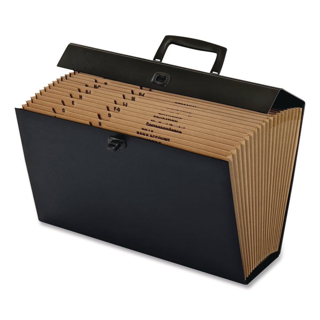 Store and transport important documents in a sturdy case file from Pendaflex®. Fusing elements of both an expanding transport wallet and a file-transport case, this file's rigid, laminated exterior, fold-over lid, twist-lock closure and molded-plastic carry handle ensure easy transport, while its interior, multi-section accordion file simplifies document management. The durable Kraft accordion file also features a pre-printed A to Z index with associated subject headings and tear-resistant-tape reinforced gussets.