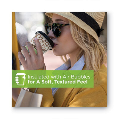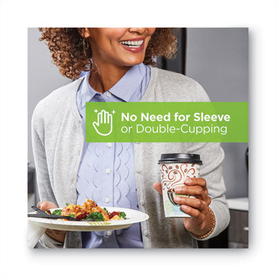 Patented paper process creates a specially insulated cup and eliminates need for costly double-cupping. Cup design provides comfortable, secure feel and non-slip hold. Contains no polystyrene foam.