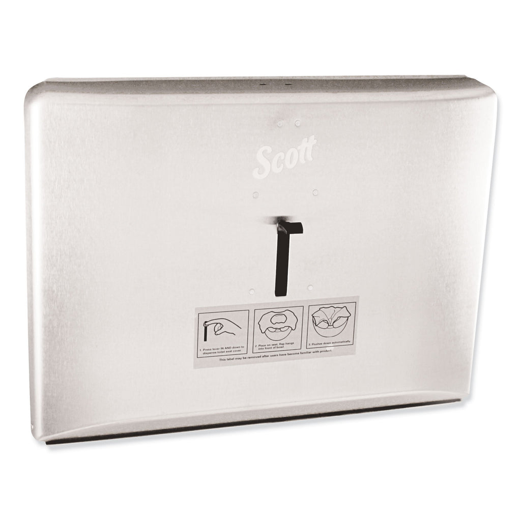 Push lever dispenses one seat cover at a time. Replaceable lock with push-button option. Key guard prevents theft (key included). Simplified door hinge for easier filling. Mounting screws included.