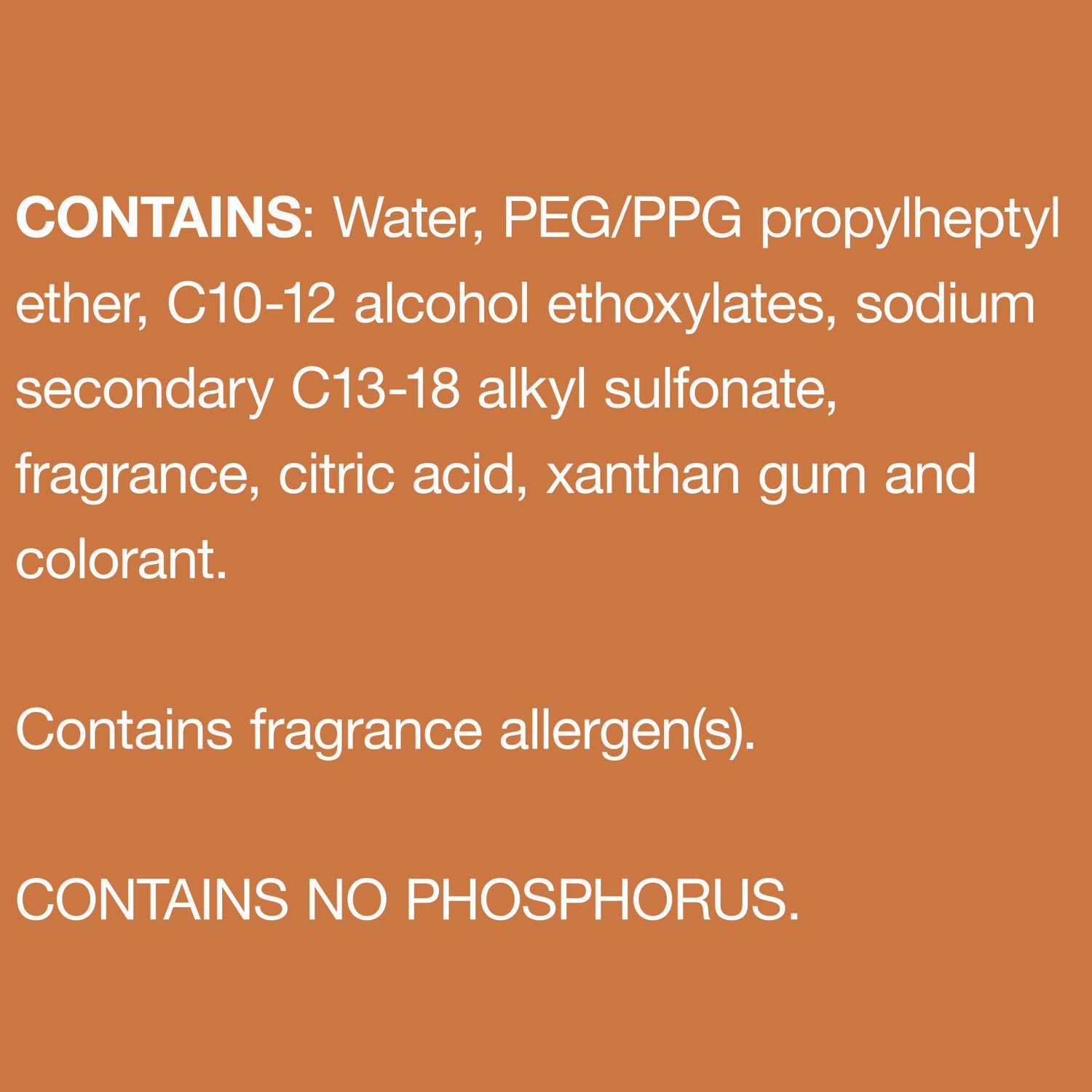 | Chemical Compound | Water; PEG/PPG Propylheptyl Ether; C10-12 Alcohol Ethoxylates; Sodium Secondary C13-18 Alkyl Sulfonate; Fragrance; Citric Acid; Xanthan Gum and Colorant; Contains Fragrance Allergen(s); CONTAINS NO PHOSPHORUS |