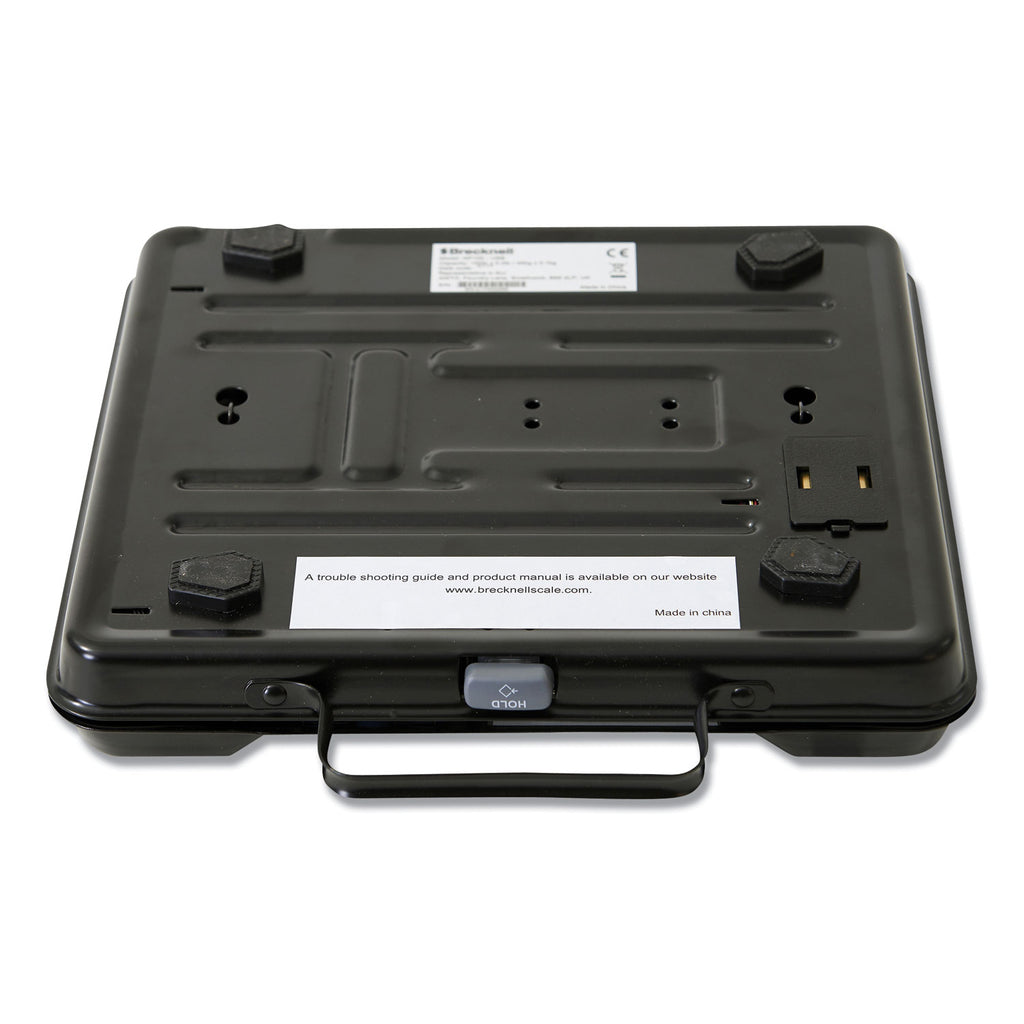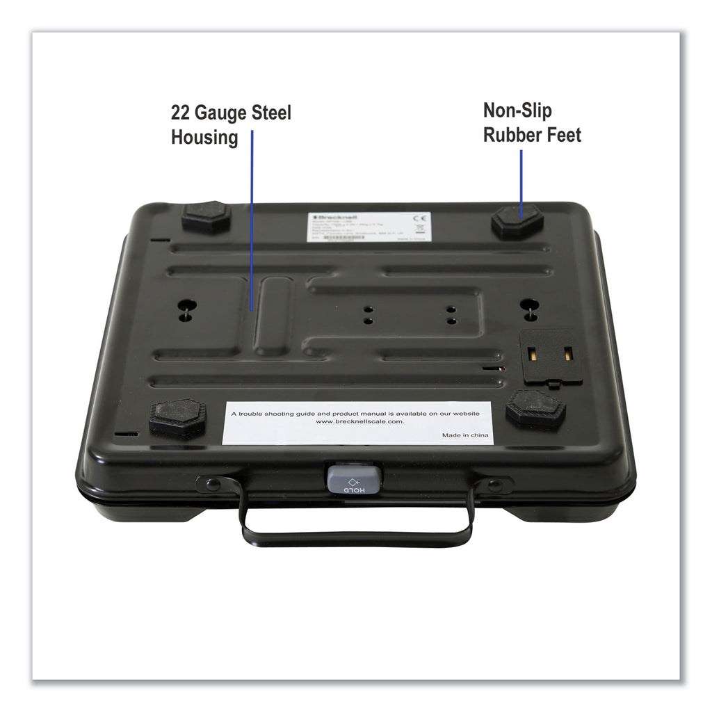 Portable bench scale which is designed for greater accuracy with attached handle. Weight hold key locks weight reading when a larger package blocks the display. Internal backlit display with four 1" high LCD digits for easy visibility. Discreet keyboard technology. Electro-mechanic design. 22-gauge steel base. Auto-zero tracking and manual zero return. Programmable auto-shut-down.