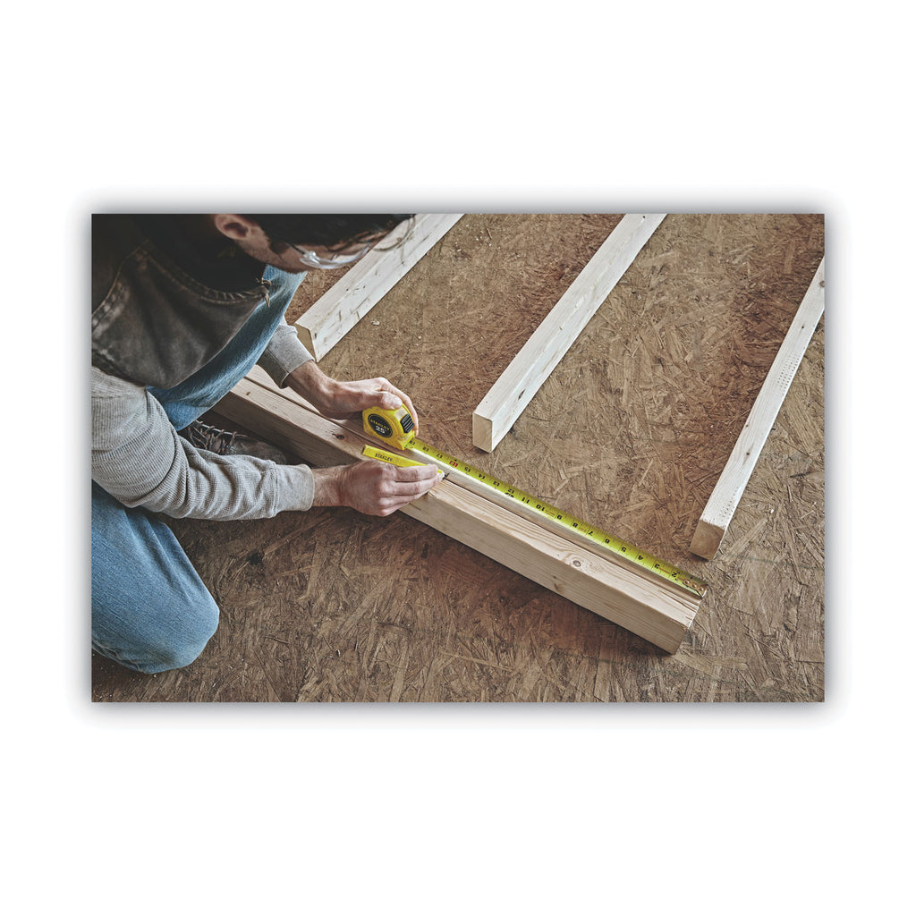 Sturdy, reliable and easy to use with a squeeze-lock blade return. Yellow steel blade remains rigid up to 7 ft. Graduations in 1/16" on top and bottom edge. High-impact yellow plastic case.